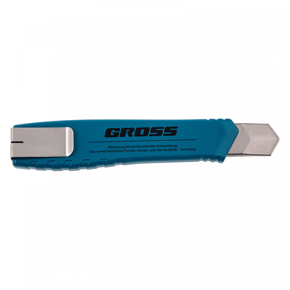 Нож Gross 78897 из стали SK-5, длиной 160 мм, в металлическом корпусе, с выдвижным сегментным лезвием шириной 18 мм, металлической направляющей и клипсой для ремня, — профессиональный инструмент, предназначенный для разрезания линолеума, картона, кожи, обоев и других материалов. Используется при проведении ремонтных и отделочных работ, будет полезен в хозяйстве.