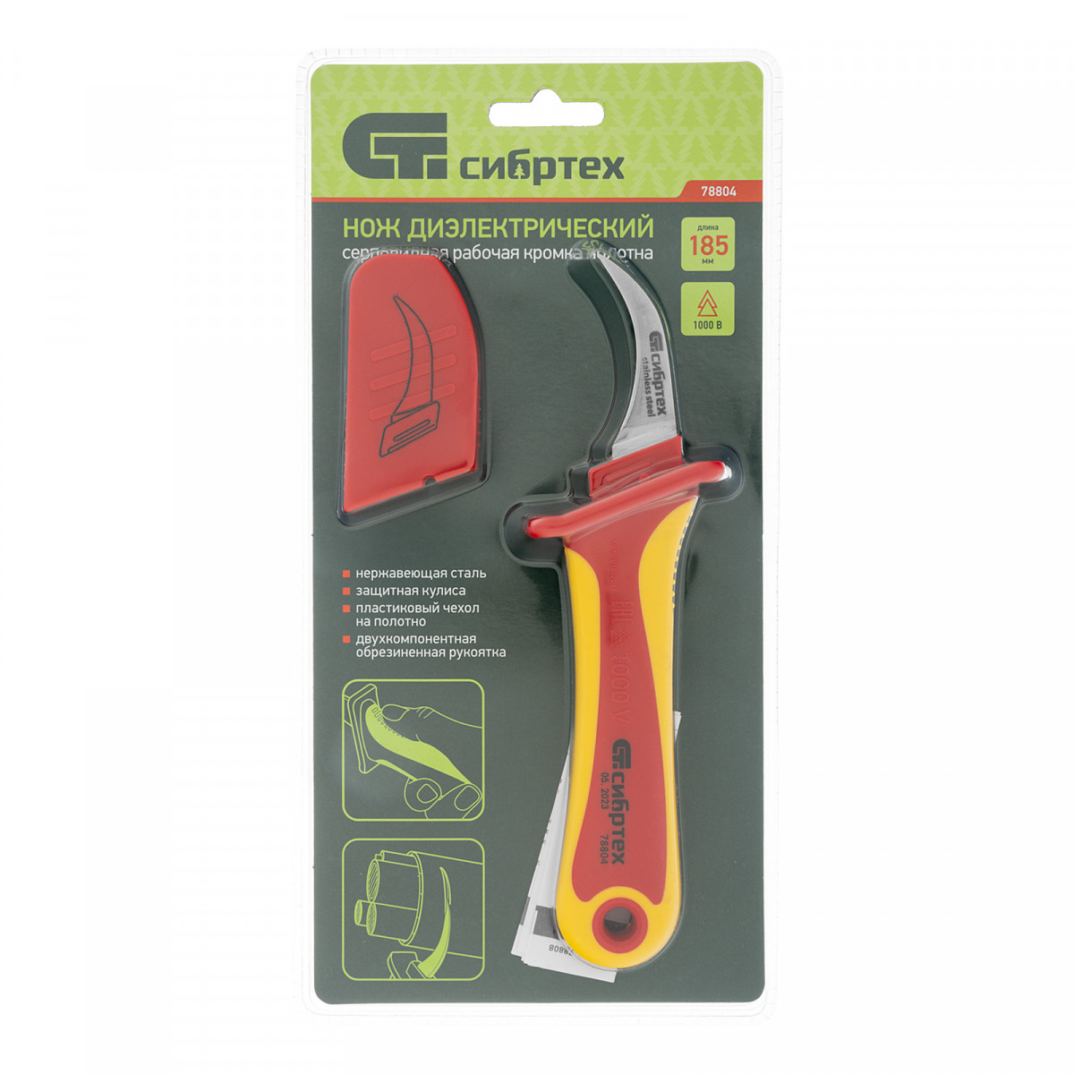 Диэлектрический нож до 1000 В Сибртех 78804 с серповидной рабочей кромкой полотна будет полезен во время электромонтажных работ. С его помощью можно снять изоляцию с кабеля и зачистить электрожилы. Во время использования необходимо соблюдать требования технической безопасности, перед выполнением работ требуется отключить напряжение.