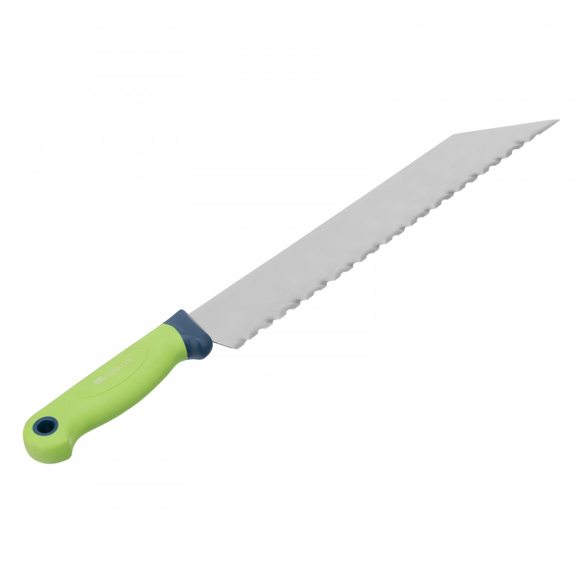 Нож Сибртех 79025 общей длиной 475 мм и длиной лезвия 340 мм, с обрезиненной рукояткой, предназначен для резки теплоизоляционных панелей. Он пригодится в ходе проведения строительных работ при укладке утеплителя. Лезвие длиной 340 мм легко справляется с резкой длинных и толстых пластов.