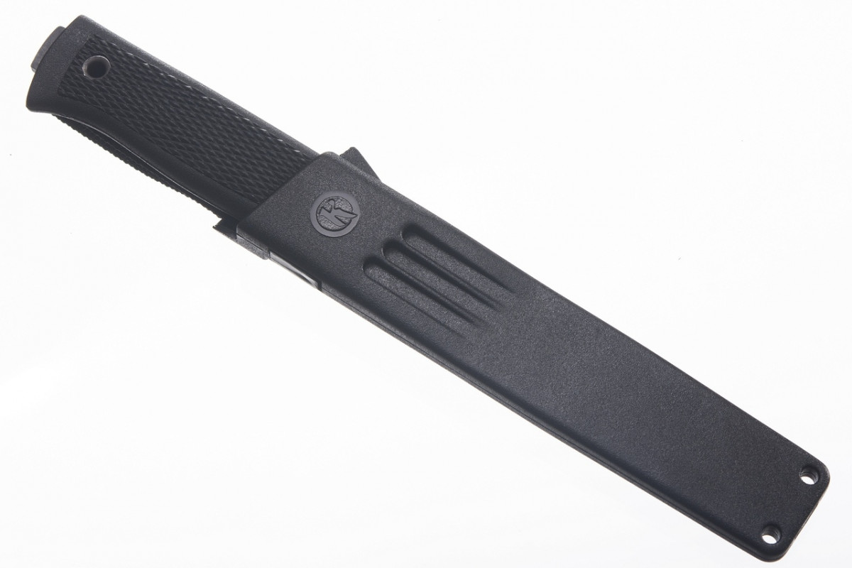 Отличительные особенности ножа – практичная форма, удобная эргономичная рукоять с цепким рифлением и малый вес, в совокупности делают из новинок отличных помощников на каждый день. Тонкое сведение и толщина 3.8мм позволили добиться отличных режущих качеств. Конструкция ножа сплошная, т.е металл на клинке и рукояти представляют собой монолитную конструкцию. Предусмотрено и отверстие для темляка, которое представлено в виде втулки из нержавеющей стали. Хвостовик ножа выходит у основания рукояти и предсталяет из себя площадку с небольшим радиусом. Вы всегда сможете воспользоваться этим конструктивным элементом, если вам понадобиться совершать действия связанные с ударной нагрузкой. Поставляется в комплекте с удобным пластиковым чехлом, в котором нож сидит плотно и не издает раздражающего дребезжания. На торцевой части чехла предусмотрен подпальцевый выступ, для того, чтобы можно было вынимать нож одной рукой. Надежный и практичный нож, который отлично подойдет для решения ежедневных хозяйственно-бытовых задач. Нож выполнен из цельного куска металла и собран по технологии сквозного монтажа. Благодаря этому, в тыльной части нож имеет металлический тыльник, который может использоваться как инструмент для нанесения ударной нагрузки (например, в качестве стеклобоя). Клинок ножа имеет прямую форму с небольшим изгибом. Обух ножа имеет фальшлезвие с небольшим понижением к кончику. Толщина обуха 3,8 миллиметра. Сведение начинается от середины ножа и плавно переходит в режущую кромку. Сведение очень тонкое, что обеспечивает отличный рез по материалам различной плотности. Рукоять ножа имеет эргономичную форму, которая обеспечивает надежный захват, как голой рукой, так и в перчатке. Рукоятка выполнена из эластрона и имеет цепкое рифление. Ближе к тыльной части рукоятка имеет отверстия для подвеса или темляка. Нож поставляется вместе с практичными ножнами из прочного пластика, которые обеспечивают надежную фиксацию клинка, что исключает выпадение ножа или его дребезжание. Ножны имеют петлю из стропы для удобного размещения ножа на поясе или на снаряжении.