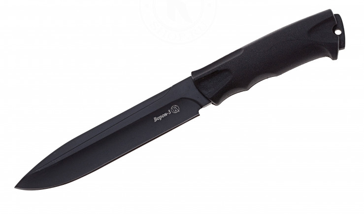 «Ворон-3» Кизляр снабжен повторяющей форму ладони рукоятью из эластрона. Данный материал не боится сырости, перепада температур, ударов и воздействия агрессивных веществ, а его великолепные антифрикционные свойства делают работу с ножом безопасной. Для повышения срока службы черен напрессовывается на идущий по всей длине рукояти хвостовик. В комплекте с ножом «Ворон-3» идут удобные поясные ножны.
