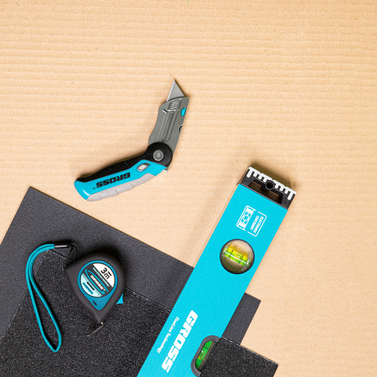 Складной ремонтно-монтажный нож Gross 78882 длиной 175 мм, с трехкомпонентной рукояткой, контейнером-держателем для лезвий и 2 запасными полотнами — режущий инструмент профессионального назначения. Используется для раскройки линолеума и обоев, разрезания картона, гипсокартона, кожи и других материалов. Нож защищен от самопроизвольного раскладывания — на боковой части имеется специальный стопор, фиксирующий держатель лезвия внутри корпуса.