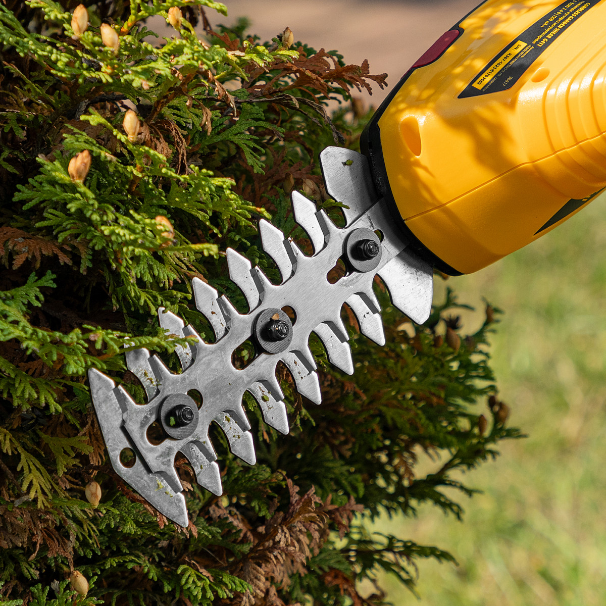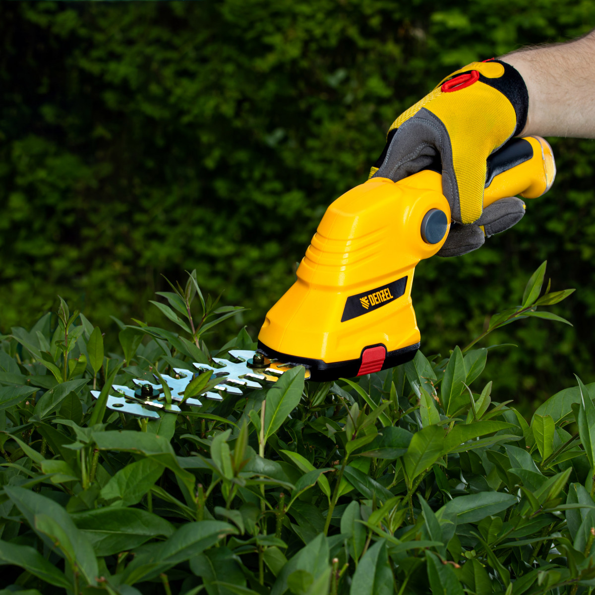 Аккумуляторные ножницы-кусторез Denzel G411 968177 с Li-Ion батареей напряжением 3,6 В и емкостью 1,5 Ач предназначены для поддержания декоративной растительности на дачном участке в аккуратном виде. В комплект входят две оснастки: для подрезания газонной травы и для обрезки кустов и тонких веток деревьев. Благодаря простому управлению и малому весу 0,6 кг с ножницами-кусторезами легко справятся даже пожилые люди.
