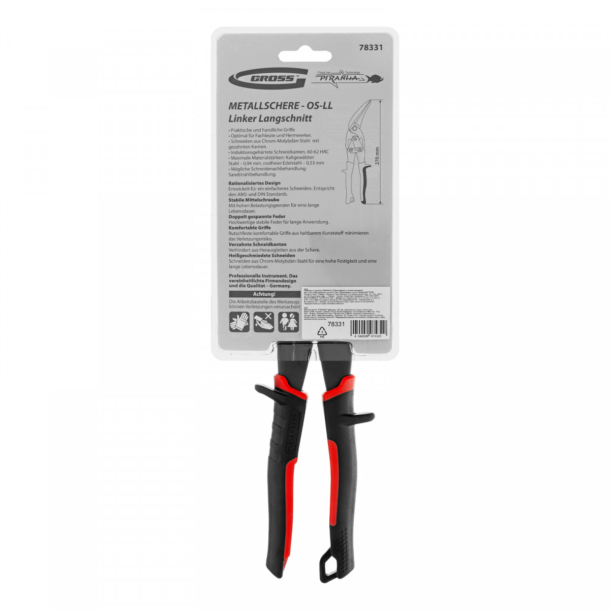 Ножницы по металлу Gross PIRANHA 78331 длиной 270 мм, из стали CrMo, с двухкомпонентными рукоятками, выполняют прямой и левый проходной рез по листовому металлу. Режут не только цветные металлы, но и стали — холоднокатаную толщиной до 0,94 мм и нержавеющую толщиной до 0,53 мм. Нагрузка на руку при этом снижается за счет двойного рычажного механизма. Ножницы рекомендованы для выполнения профессиональных слесарных работ.