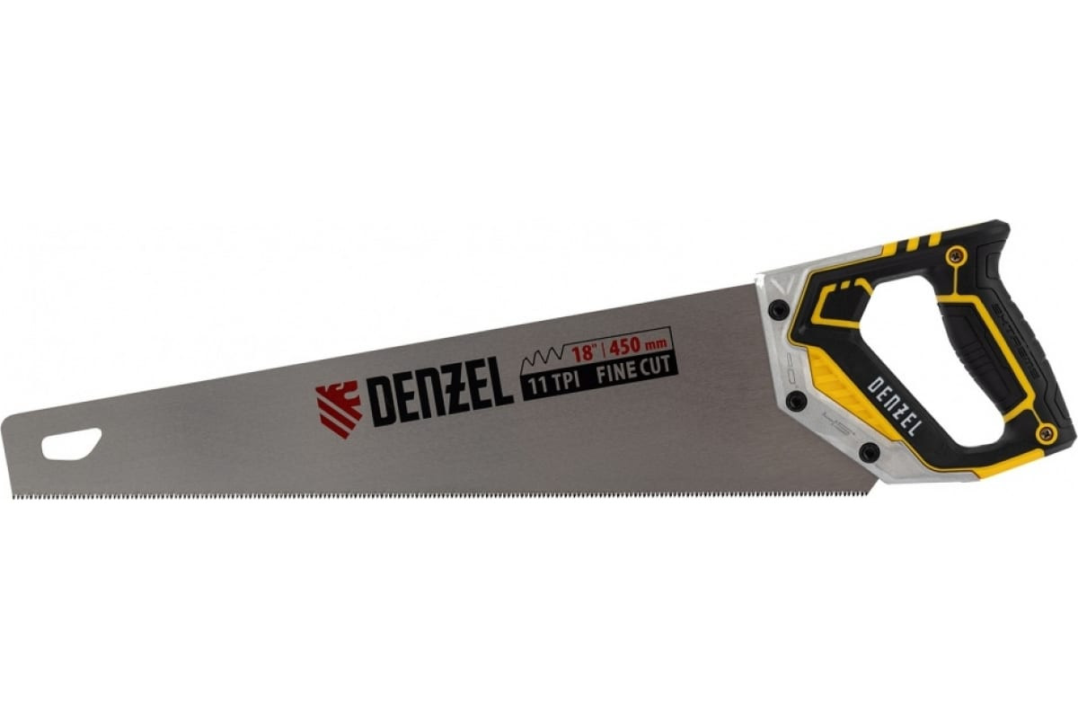 Ножовка по дереву Denzel, 450 мм, 11 TPI, зуб 3D, металлопластиковая рукоятка 24141 предназначена для столярных работ- распиловка заготовок из древесины, ДСП, ДВП, МДФ, ламината, а также из ПВХ (труба, панель, короб). Может производить продольный и поперечный распил. Мелкие зубья с шагом 11 TPI позволяют выполнять более точный и чистый рез. Ножовка обладает высокой производительностью благодаря агрессивной трехгранной, многоступенчатой заточке зубьев, которая обеспечивает идеальную геометрию и высокую остроту зуба.Пильное полотно изготовленное из японской стали SK-5. Закалка ТВЧ обеспечивает дополнительную твердость зуба 55-58 HRC. Благодаря эргономичной форме и рифленой поверхности, металлопластиковая обрезиненная рукоятка удобно ложится в руку и не скользит, обеспечивая комфорт во время интенсивной работы.