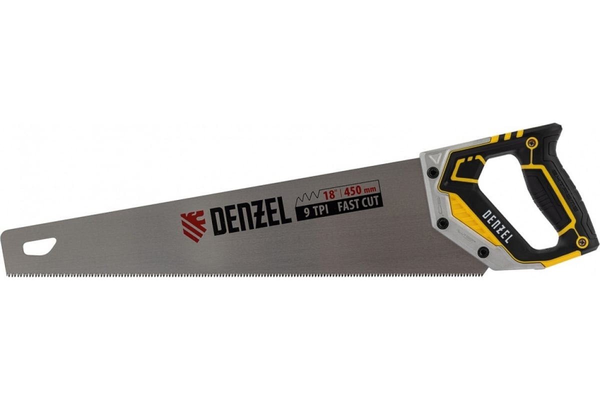 Ножовка по дереву Denzel, 450 мм, 9 TPI, зуб 3D, металлопластиковая рукоятка 24140 предназначена для столярных работ- распиловка заготовок из древесины, ДСП и OSB. Может производить продольный и поперечный распил. Ножовка обладает высокой производительностью благодаря агрессивной трехгранной, многоступенчатой заточке зубьев, которая обеспечивает идеальную геометрию и высокую остроту зуба.