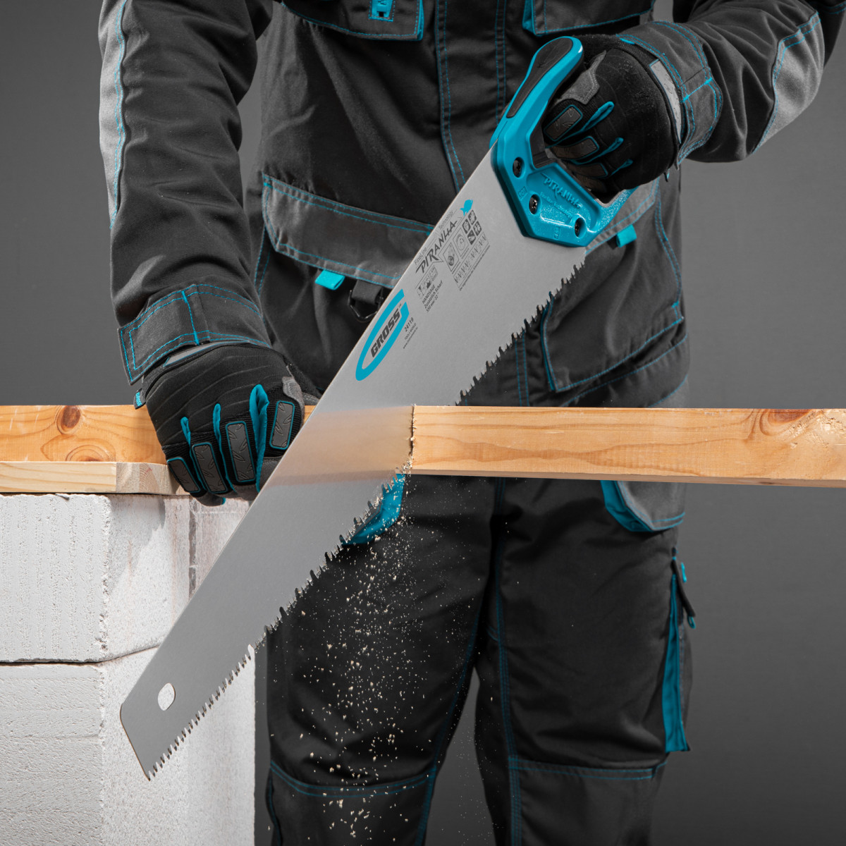 Ножовка по дереву Gross PIRANHA 24119 с полотном длиной 550 мм, зубьями с 3D-заточкой и шагом 7-8 TPI, с 2-компонентной рукояткой, имеет сегментное строение рабочей кромки и предназначена для продольного и поперечного распиливания древесины, МДФ, ДСП, ДВП, а также пенополистирола, полиуретана и других синтетических материалов. Зубья с универсальным шагом 7-8 TPI обеспечивают быстрый и ровный рез, а их трехгранная заточка увеличивает производительность ножовки. Разделение рабочей кромки на сегменты улучшает отвод стружки, благодаря чему полотно не застревает в материале заготовки. Ножовка пригодится столярам, плотникам, а также будет полезна домашним мастерам.