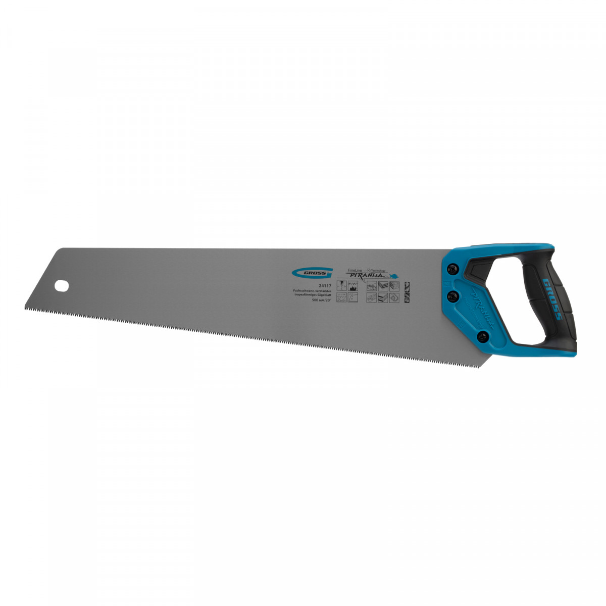Ножовка по дереву Gross PIRANHA 24117 с усиленным трапециевидным полотном длиной 500 мм, калеными зубьями с 3D-заточкой и шагом 11-12 TPI, с двухкомпонентной рукояткой, используется для выполнения столярных работ. Ей пилят древесину различных пород, МДФ, ДСП, ДВП, ламинат, а также пенополистирол, полиуретан и другие синтетические материалы. Ножовка подходит для продольного и поперечного пиления. Благодаря мелким зубьям с шагом 11-12 TPI выполняет точный и чистый рез. Инструмент рекомендован для профессионального применения, но может использоваться и в быту.