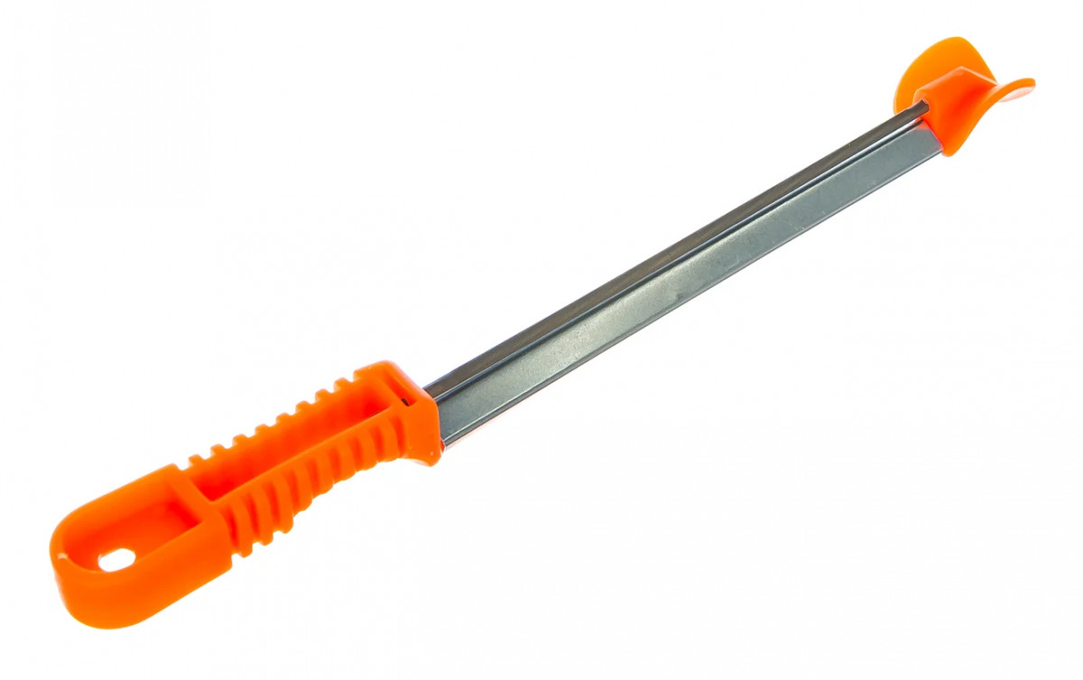 Обойма с напильником имеет классический дизайн. Состоит из металлического корпуса и эргономичной пластиковой рукоятки. Представленный набор станет оптимальным вариантом для быстрой и качественной заточки цепей.