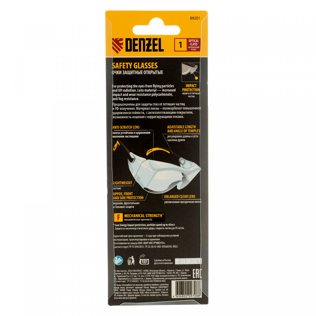 Очки защитные открытые Denzel 89201 с увеличенными поликарбонатными прозрачными линзами и регулируемыми дужками предназначены для защиты глаз от механических повреждений и УФ-излучения. Очкам присвоен класс механической прочности F, они обеспечивают защиту от высокоскоростных частиц с низкоэнергетическим ударом (скорость частиц до 45 м/с). Легкие универсальные очки используются во время работы с электро- и бензоинструментом, на производстве и в быту.