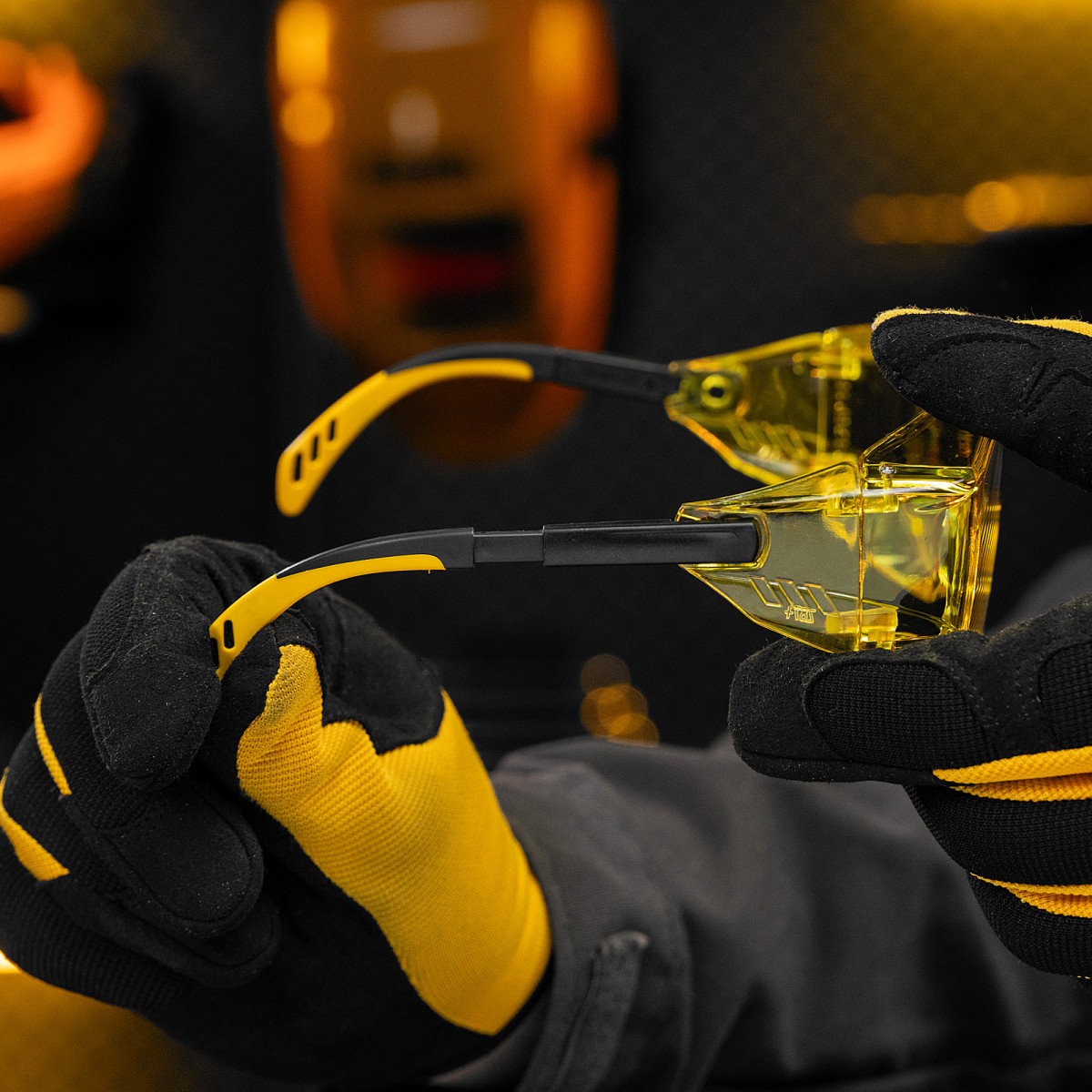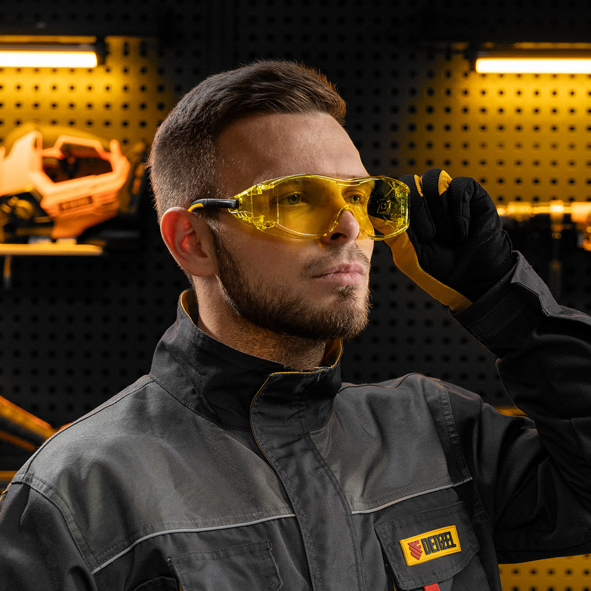 - Продуманная конструкция — особая форма линз обеспечивает боковую и надбровную защиту, а также позволяет носить защитные очки вместе с коррригирующими.