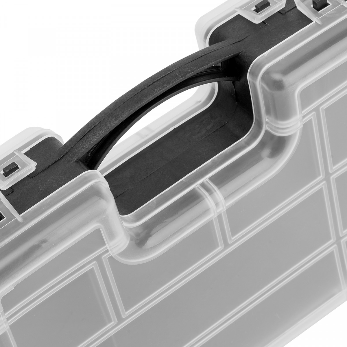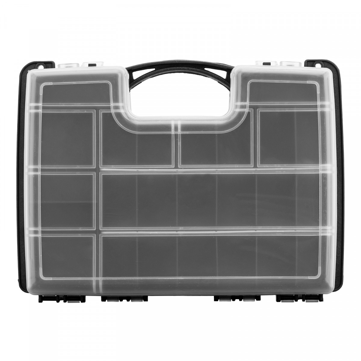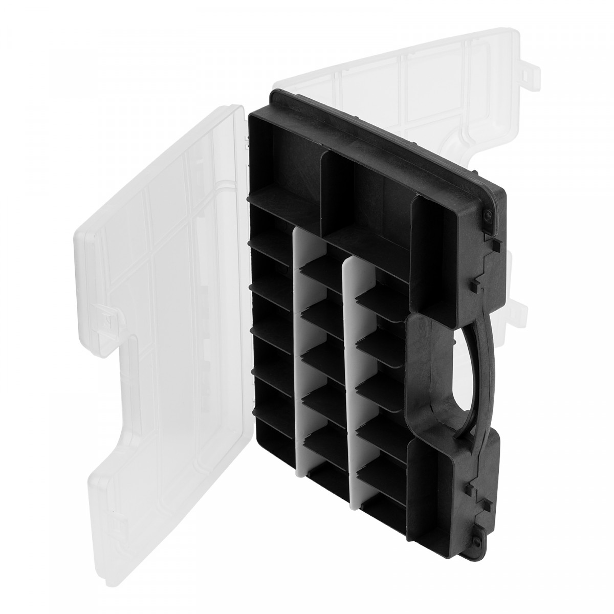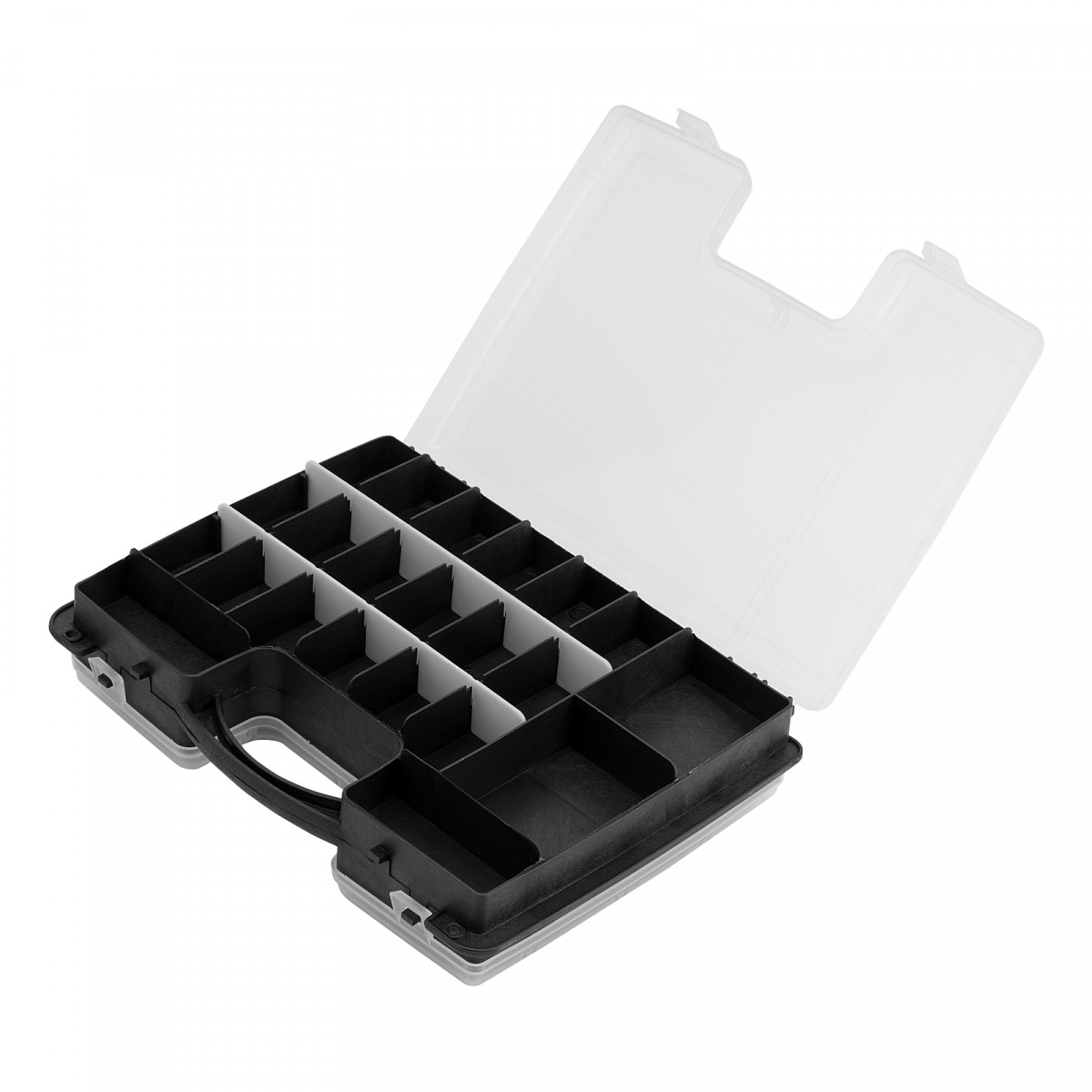 Двухсторонний органайзер Сибртех 90738 размером 295 х 220 х 76 мм помогает рассортировать мелкие вещи и хранить их в порядке и безопасности. В него можно положить снасти, крепеж, элементы рукоделия и т.д. Органайзер не занимает много места, поэтому его можно поместить под кровать, на стеллаж и в другие укромные места.