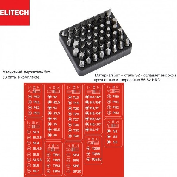 Отвертка с магнитным наконечником, с многопрофильным набором бит длиной 25 мм из хромованадиевой стали (CrV). 53 биты: 8шт. slotted:3,3.5, 4,4.5, 5,5.5, 6,7 мм 4шт. pozi:pz0 ,pz1,pz2,pz3 4шт. phillips:ph0,ph1,ph2,ph3 8шт. metric hex:H2,H2.5,H3,H3.5, H4,H5,H5.5,H6 мм 7шт. SAE hex:H3/32'',H7/64'',H1/8'',H9/64'', H5/32'',H3/16'',H1/4''. 8шт. torx:T10,T15,T20,T25,T27,T30,T35,T40 4шт. spanner:4, 6, 8, 10 4шт. tri-wing:1, 2, 3, 4 3шт. torq:6, 8, 10 3шт. square:S1,S2,S3