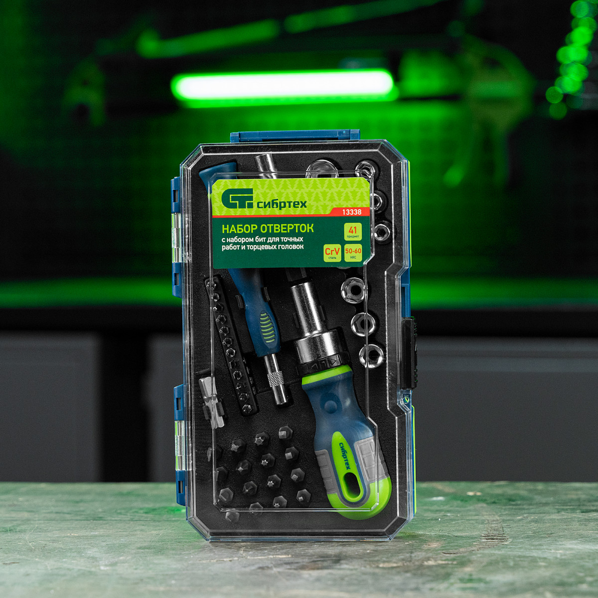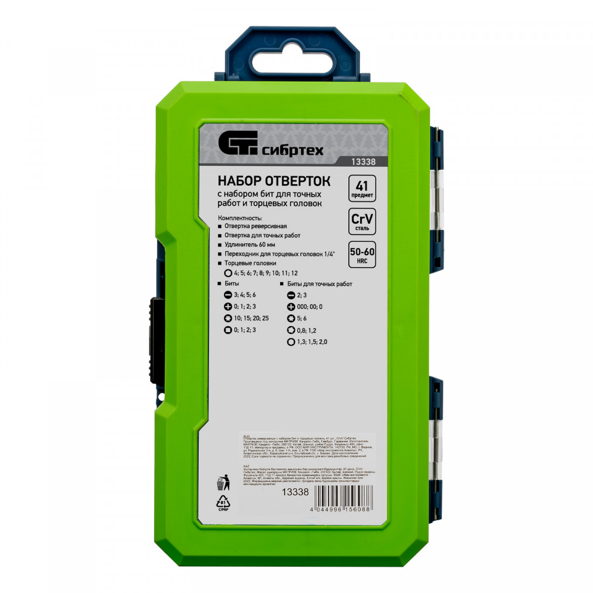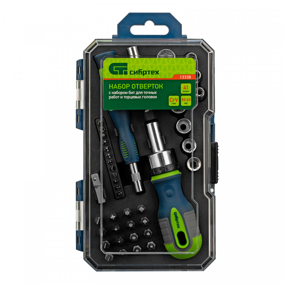 Реверсивные отвертки с набором бит и торцевых головок Сибртех 13338, 41 предмет, CrV, включает в себя насадки для работы с крепежом типа SL, PH, PZ, HEX, TORX и торцевые головки для монтажа/демонтажа гаек, болтов, саморезов. Также в нем есть отвертка и биты для точных работ, с помощью которых можно осуществить ремонт мелкой электроники, очков, детских игрушек и т.д. Удлинитель позволяет проводить работы в труднодоступных местах.