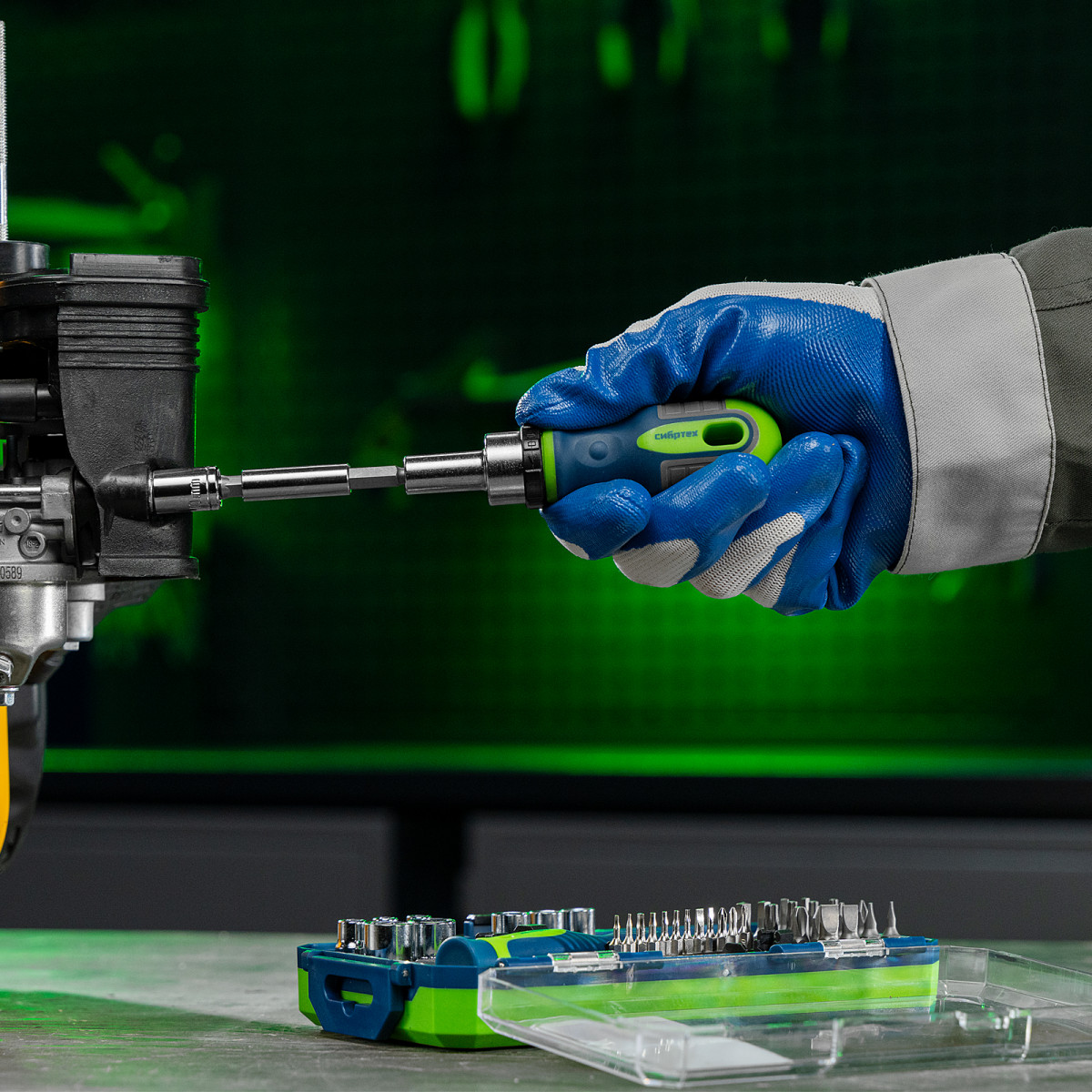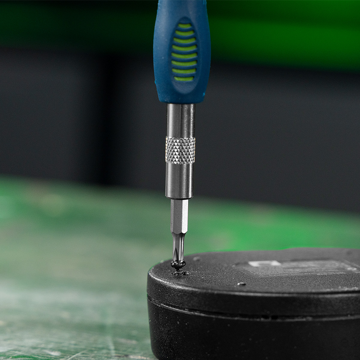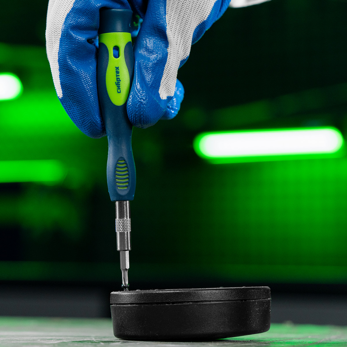 - Прочность и износостойкость — биты, торцевые головки и стержни отверток изготовлены из высококачественной хромованадиевой стали.