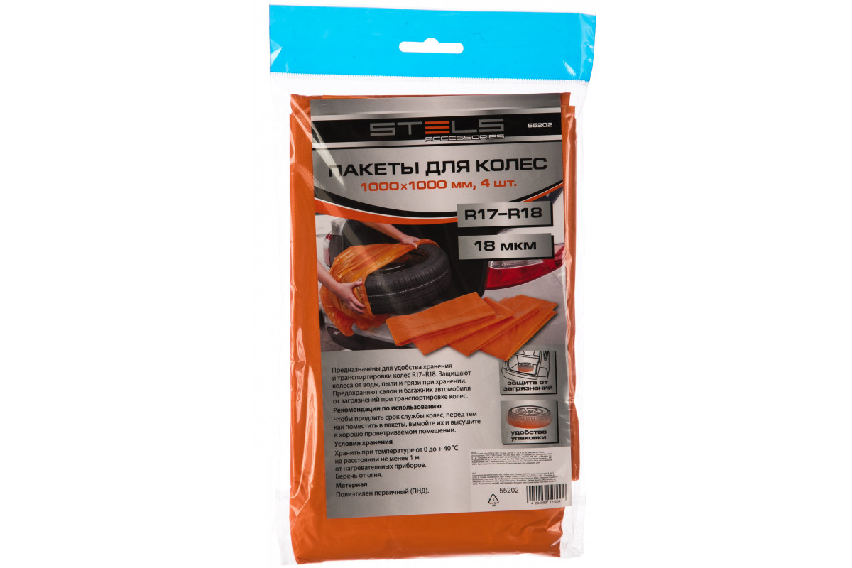 Пакеты для шин STELS 1000х1000 18 мкм 4 шт 55202 предназначены для размещения в них шин с целью хранения и транспортировки. В комплекте 4 пакета для шин радиусом 17-18 дюймов. Размер каждого пакета - 1000х1000 мм, толщина - 18 мкм.