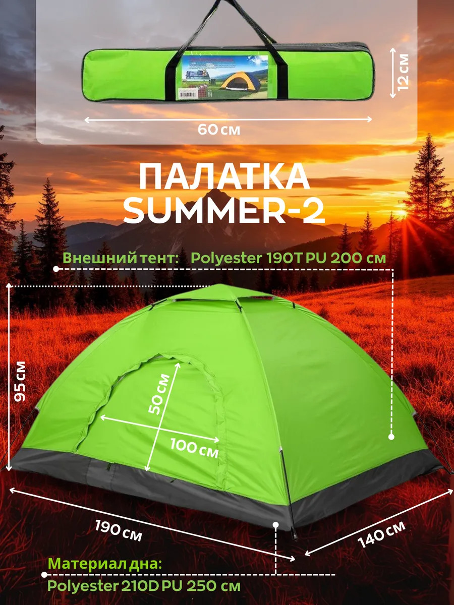 Палатка SUMMER-2 (ZH-A034-2) - это двухместная легкая и компактная палатка, которая идеально подойдет для отдыха на природе. Особенности: - Купол палатки изготовлен из однослойного материала и имеет 1 широкий вход - Тент изготовлен из полиэстера (polyester 190T) и имеет специальную пропитку, которая придает ему прочность и долговечность, а также защищает от выгорания и преждевременного износа - Антимоскитная сетка - Вентиляционные клапаны (с защитой от влаги и дождя) в верхней части палатки обеспечат комфортный микроклимат Характеристики: * Назначение: Треккинговая * Сезон: Лето * Форма палатки: Полусфера * Габариты палатки в рабочем состоянии: 190*140*95 см. * Вход: 100*55 см * Внешний тент: Polyester 190T PU 2000 мм * Материал дна: Polyester 210D PU 2500 мм * Вес палатки: 1,15 кг * Каркас: Fiberglass 7,5 мм * В комплект входят 4 ввертыша * Размер в упакованном виде: 60х12х8 см. * Цвет: зеленый