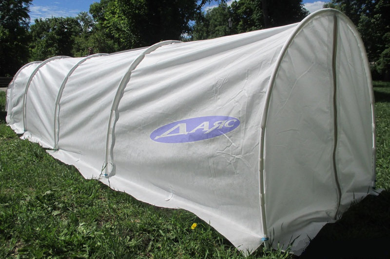 Парники с конструкцией, в которой дуги каркаса вставляются в прошитые отверстия в укрывном материале и растягиваются гармошкой. Торцы на молниях. Белая ПП дуга, Райфенхаузер SSS-60, петли, рукава.