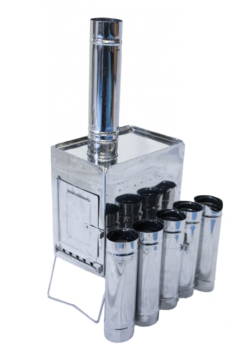 - Печка и колена трубы изготавливаются из жаропрочной нержавеющей стали марки AISI-430 толщиной 0,4 и являются самыми легкими туристическими печками, для обогрева в зимних походах туристических палаток и шатров. Для обогрева длительное время домиков, избушек, стационарных палаток необходимо использовать другие печки, изготовленные из более толстого металла