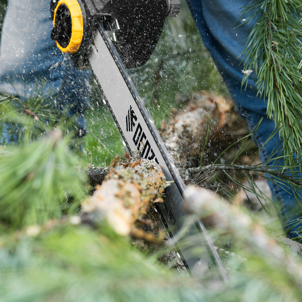 - Безопасная эксплуатация — блокировка пуска предотвращает случайное включение пилы, инерционный тормоз цепи мгновенно останавливает ее вращение при резком отскоке инструмента в сторону пользователя.