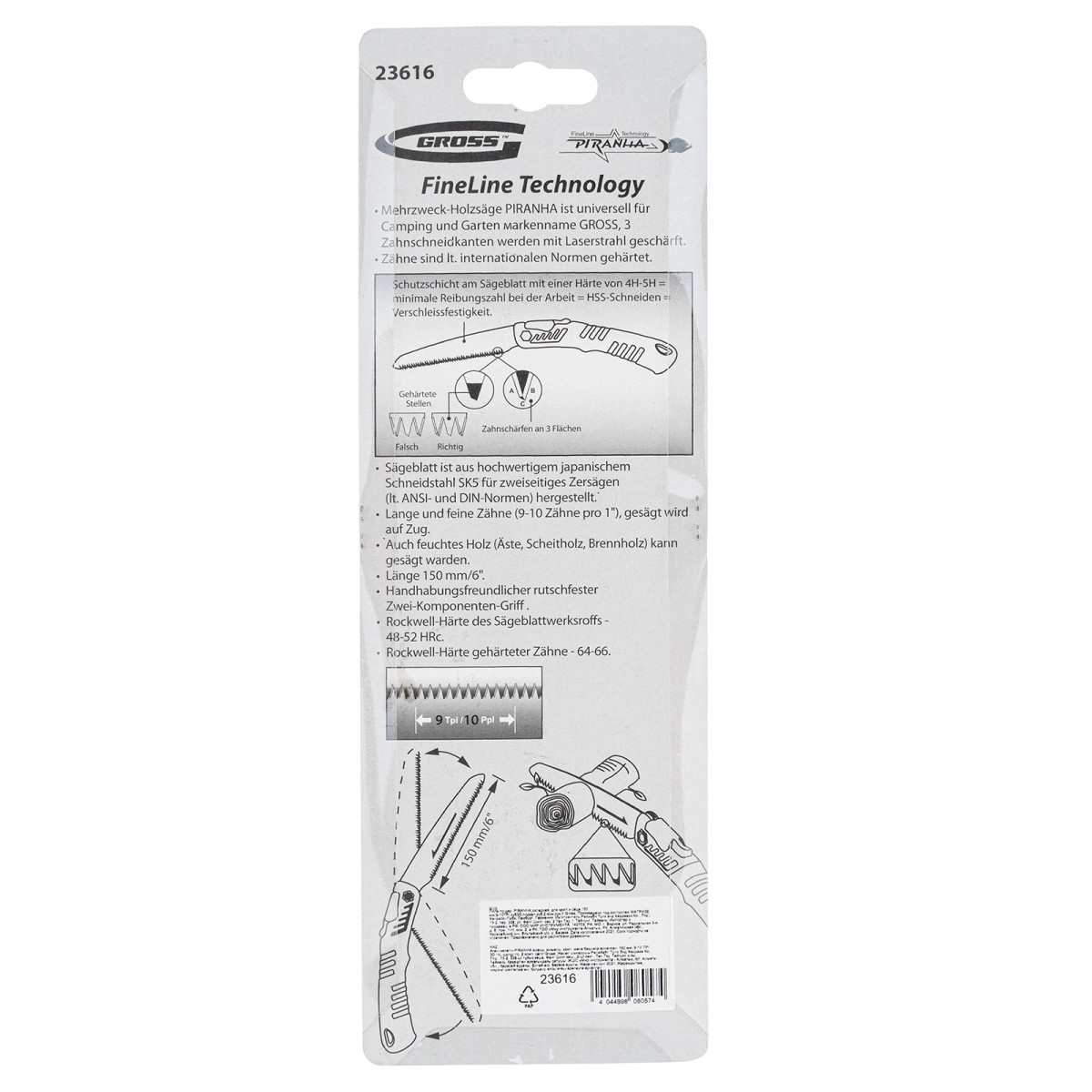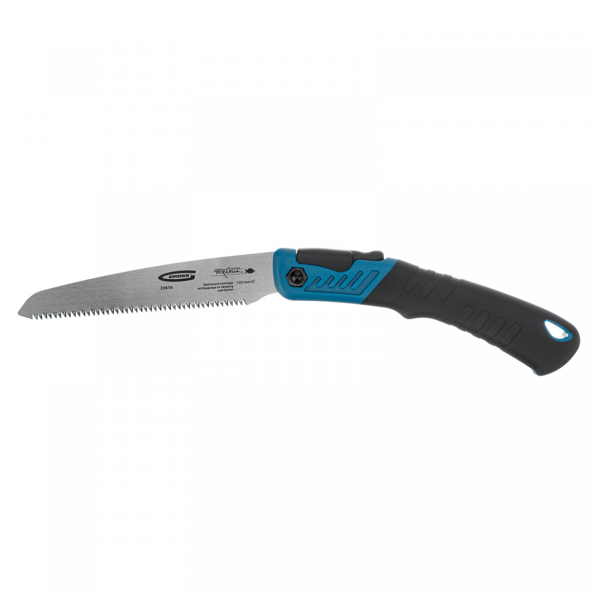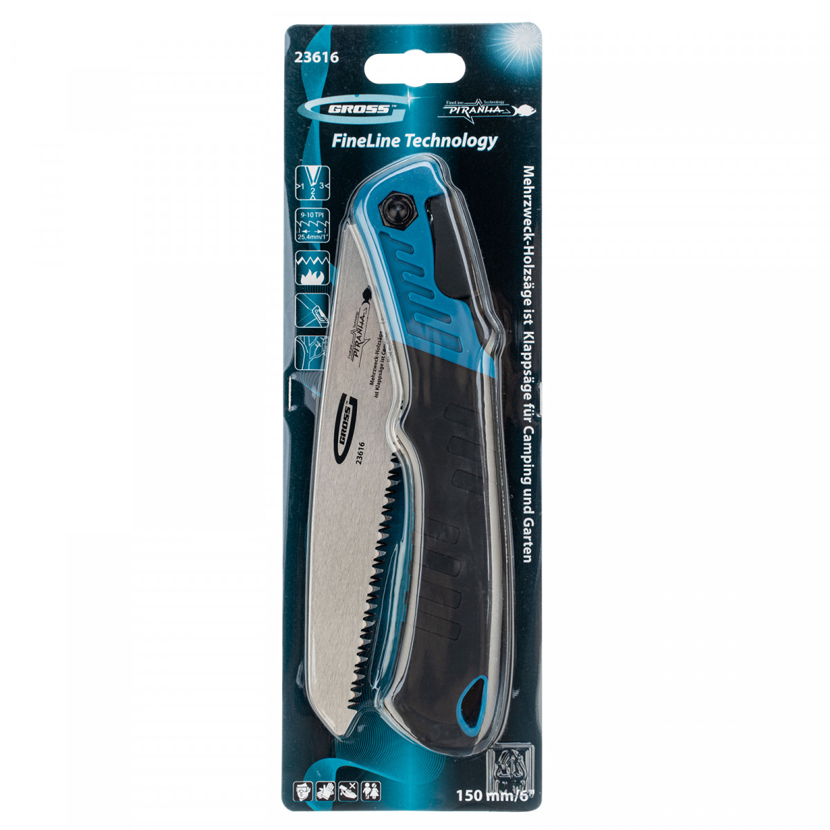 Складная пила по дереву Gross PIRANHA 23616 для кемпинга и сада с 2-компонентной рукояткой, полотном длиной 150 мм, подкаленными зубьями с шагом 9-10 TPI и 3D-заточкой, пригодится на пикнике, в походе или на дачном участке. Предназначена для продольной и поперечной распиловки древесины, подходит также для работ с фанерой, ДВП и ПВХ. Характеристики режущей кромки соответствуют требованиям всех международных стандартов: зубья с трехгранной заточкой и шагом 9-10 TPI обеспечивают быстрый и ровный распил. Благодаря складной конструкции пилу очень удобно хранить и брать с собой в поездки.
