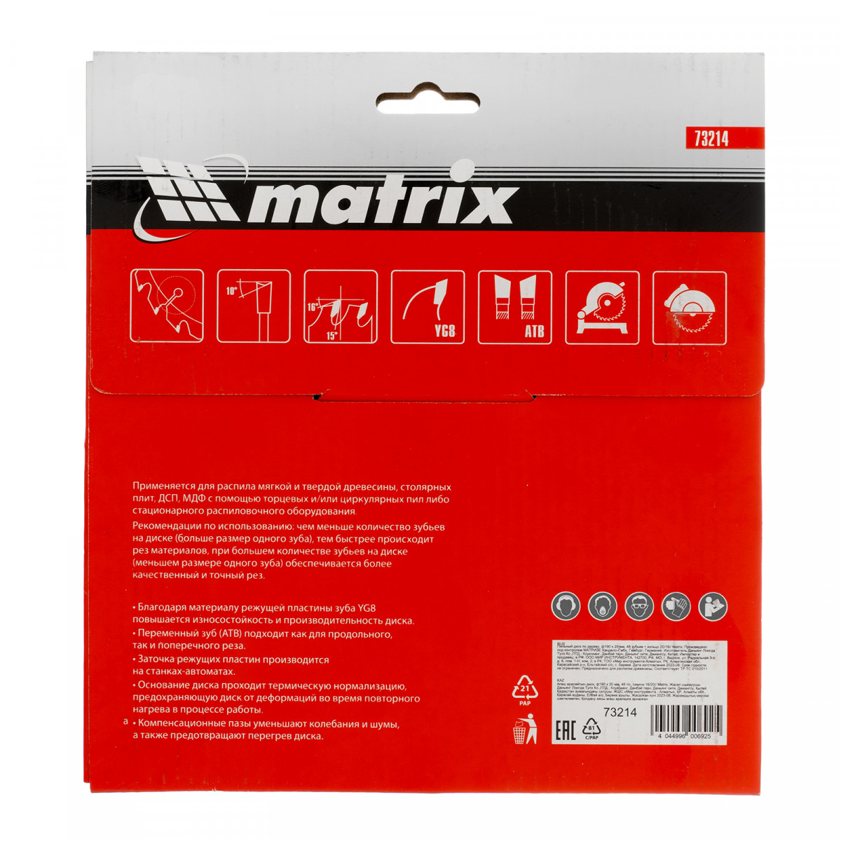 Пильный диск по дереву Matrix 73214 диаметром 190 х 20 мм, с 48 зубьями и переходным кольцом 20/16, — оснастка для циркулярных и торцовочных пил с соответствующим посадочным и внешним диаметром. Используется преимущественно для поперечного реза материалов из мягкой и твердой древесины, ДСП, ДВП, фанеры, столярных плит. В комплект поставки входит переходное кольцо 20/16, позволяющее самостоятельно изменить посадочный диаметр при необходимости. Диск подходит для бытового и профессионального применения.