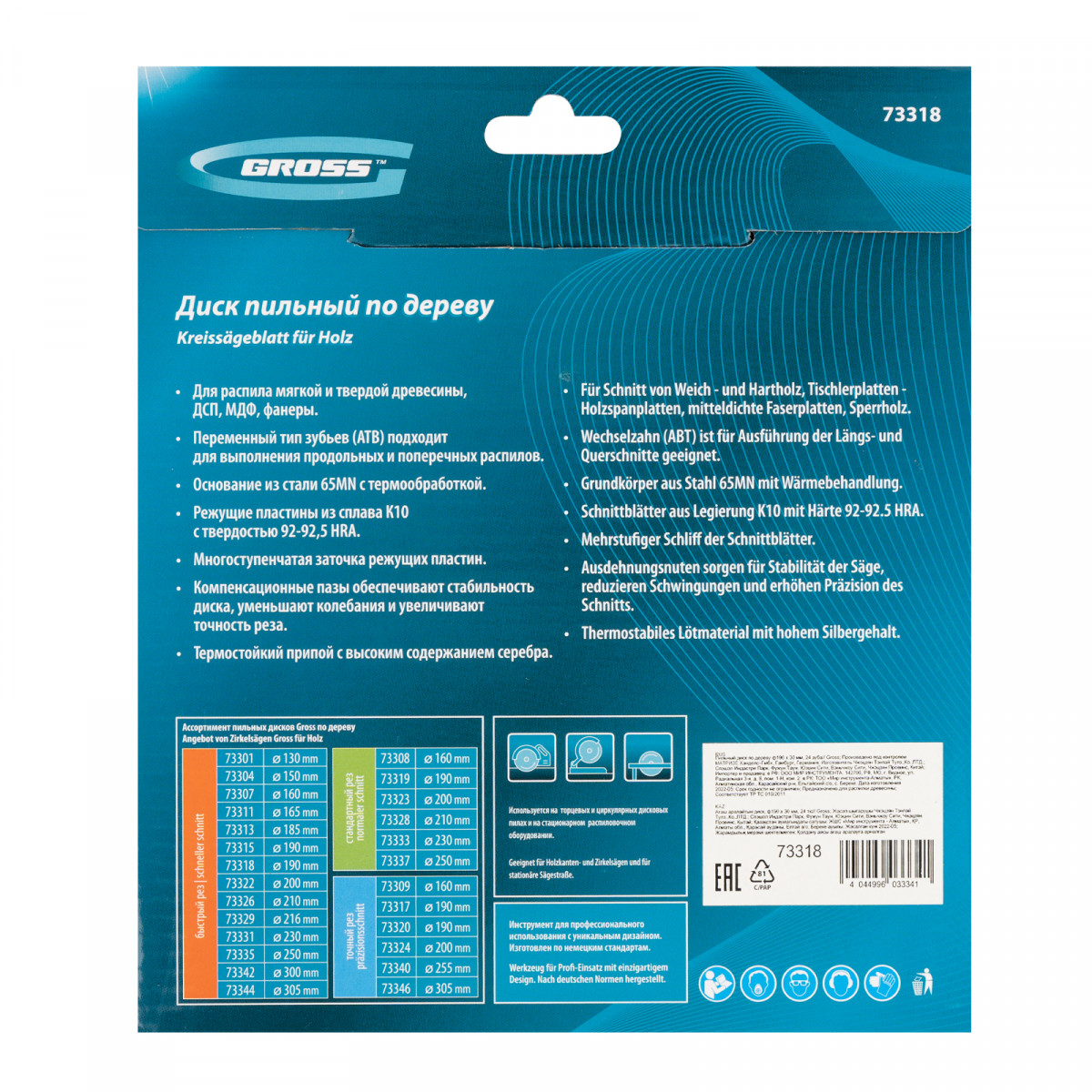 Пильный диск Gross 73318 диаметром 190 х 30 мм, с 24 зубьями, предназначен для распила древесины мягких и твердых пород, ДСП, МДФ и фанеры. Используется в качестве оснастки для циркулярных и торцовочных пил с посадочным диаметром 30 мм, благодаря универсальному типу зубьев АТВ подходит как для продольного, так и для поперечного реза материалов. Диск изготовлен на высококачественном оборудовании, специально рассчитан на профессиональное применение и выполнение большого объема работ.