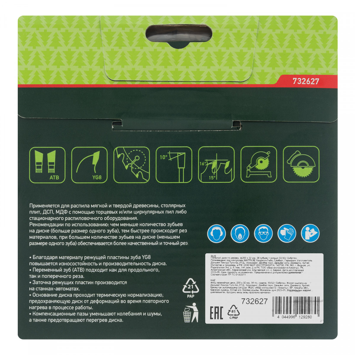 Пильный диск по дереву Сибртех 732627 диаметром 200 х 32 мм, с 36 зубьями и переходным кольцом 32/30, предназначен для быстрого распила древесины мягких и твердых пород, фанеры, ДСП, МДФ. Используется с циркулярными и торцовочными пилами с посадочным диаметром 32 мм. Переходное кольцо 32/30 позволяет при необходимости изменить размер посадки. Крупные зубья обеспечивают быстрый рез. Диск подходит для бытового применения.