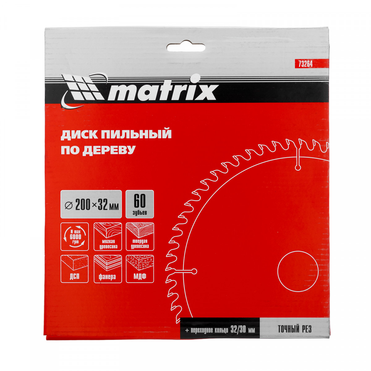 Пильный диск по дереву, 200 х 32 мм, 60 зубьев, кольцо 30/32 Matrix Professional
