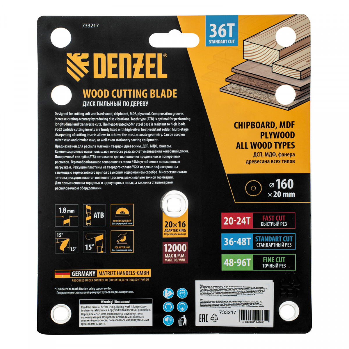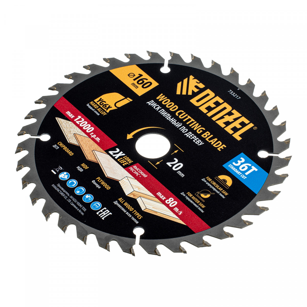 Пильный диск Denzel 733217 диаметром 160 x 20 мм, с 36 зубьями, предназначен для продольного и поперечного распила твердой и мягкой древесины, фанеры, МДФ, ДСП. 36 зубьев типа ATB с режущими пластинами оптимальной геометрии обеспечивают качественный рез. Тип реза — стандартный. Режущие пластины из твердого сплава YG6X сохраняют рабочие свойства при интенсивном использовании. Диск устанавливается на циркулярную, торцовочную пилу или на распиловочный станок. В комплект поставки входит переходное кольцо с 20 на 16 мм, что позволяет изменить посадочный размер и расширяет возможности использования диска.
