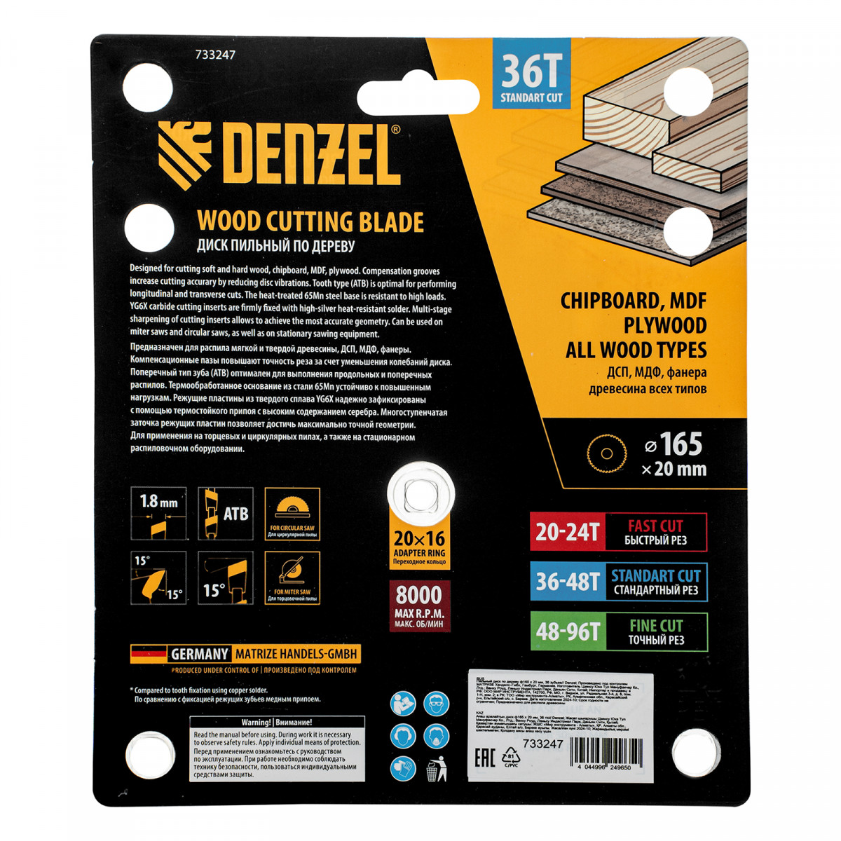 Пильный диск по дереву ф165 х 20 мм, 36 зубьев Denzel