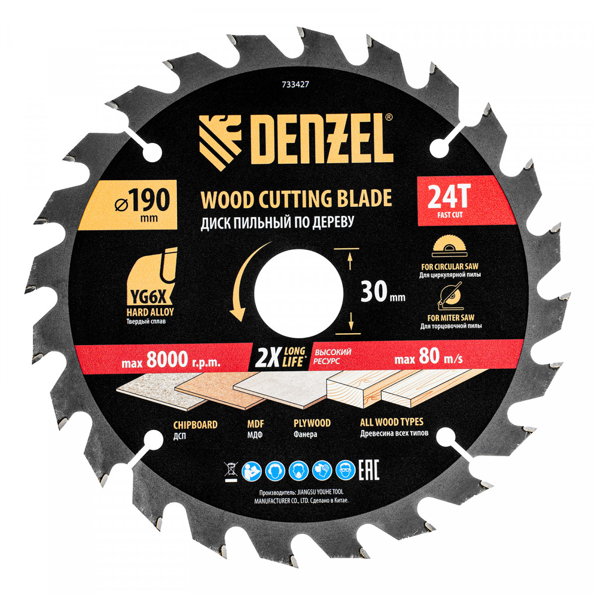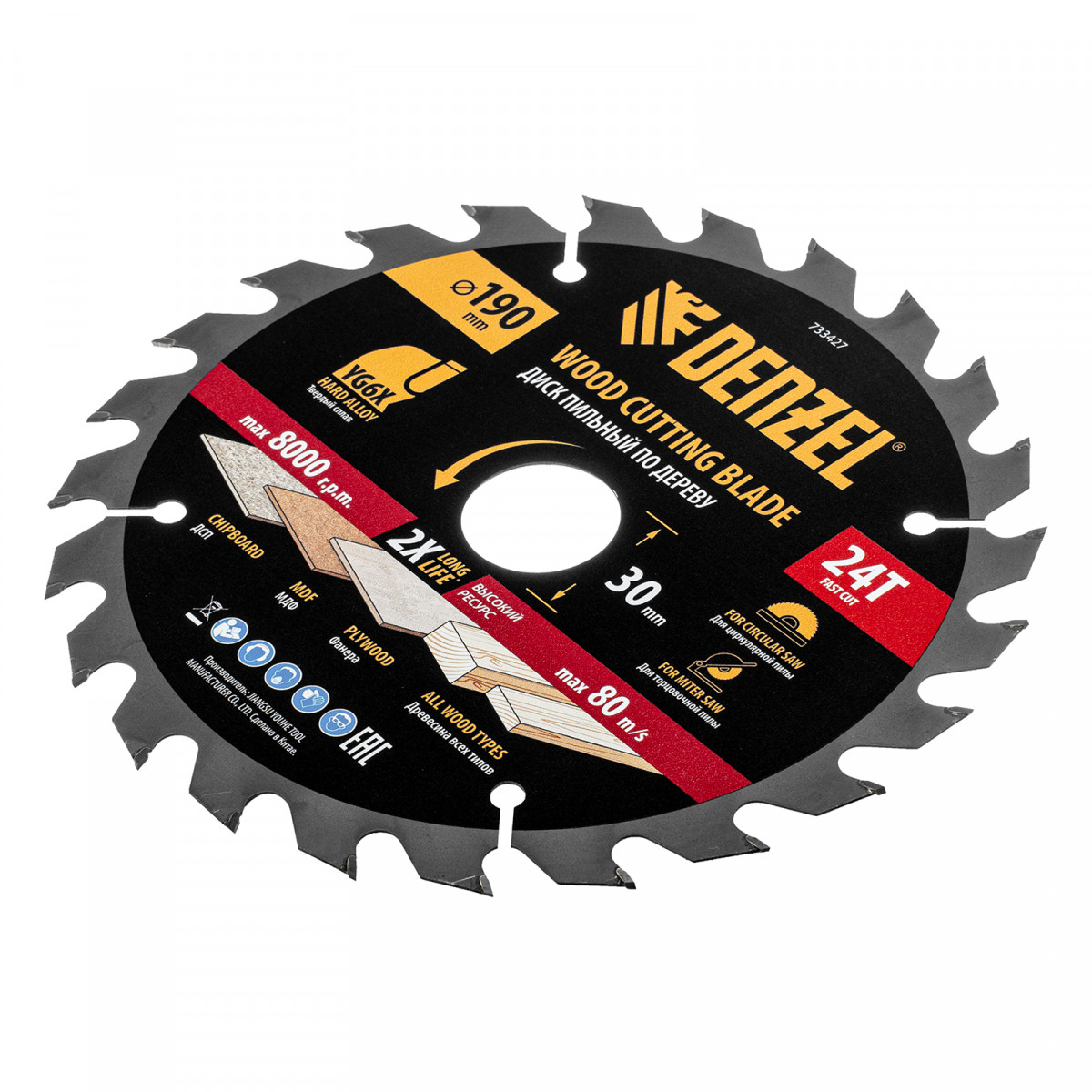 Тонкий пильный диск Denzel 733427 диаметром 190 x 30 мм, с 24 зубьями, устанавливается на циркулярную, торцовочную пилу или распиловочный станок и предназначен для выполнения работ по дереву. Подходит для быстрого реза древесины любого типа, а также фанеры, ДСП, МДФ. Крупные зубья типа ATB обеспечивают высокую скорость как продольного, так и поперечного распила. Толщина диска уменьшена, что повышает производительность и снижает нагрузку на инструмент. На зубья напаяны твердосплавные пластины, длительное время сохраняющие режущую способность. Пластины из твердого сплава YG6X прошли многоступенчатую заточку, что позволило достичь оптимальной геометрии и максимальной эффективности распиловки.