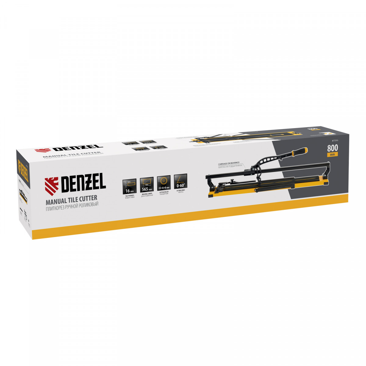 Ручной плиткорез Denzel 877016 с рельсовой направляющей и стальной станиной, с кареткой на подшипниках и усиленной рукояткой-пеналом, предназначен для прямой и диагональной резки керамической плитки и керамогранита длиной до 800 мм и толщиной до 16 мм. Раздвижные упоры упрощают работу с плиткой большого размера. Инструмент используется для проведения отделочных работ.