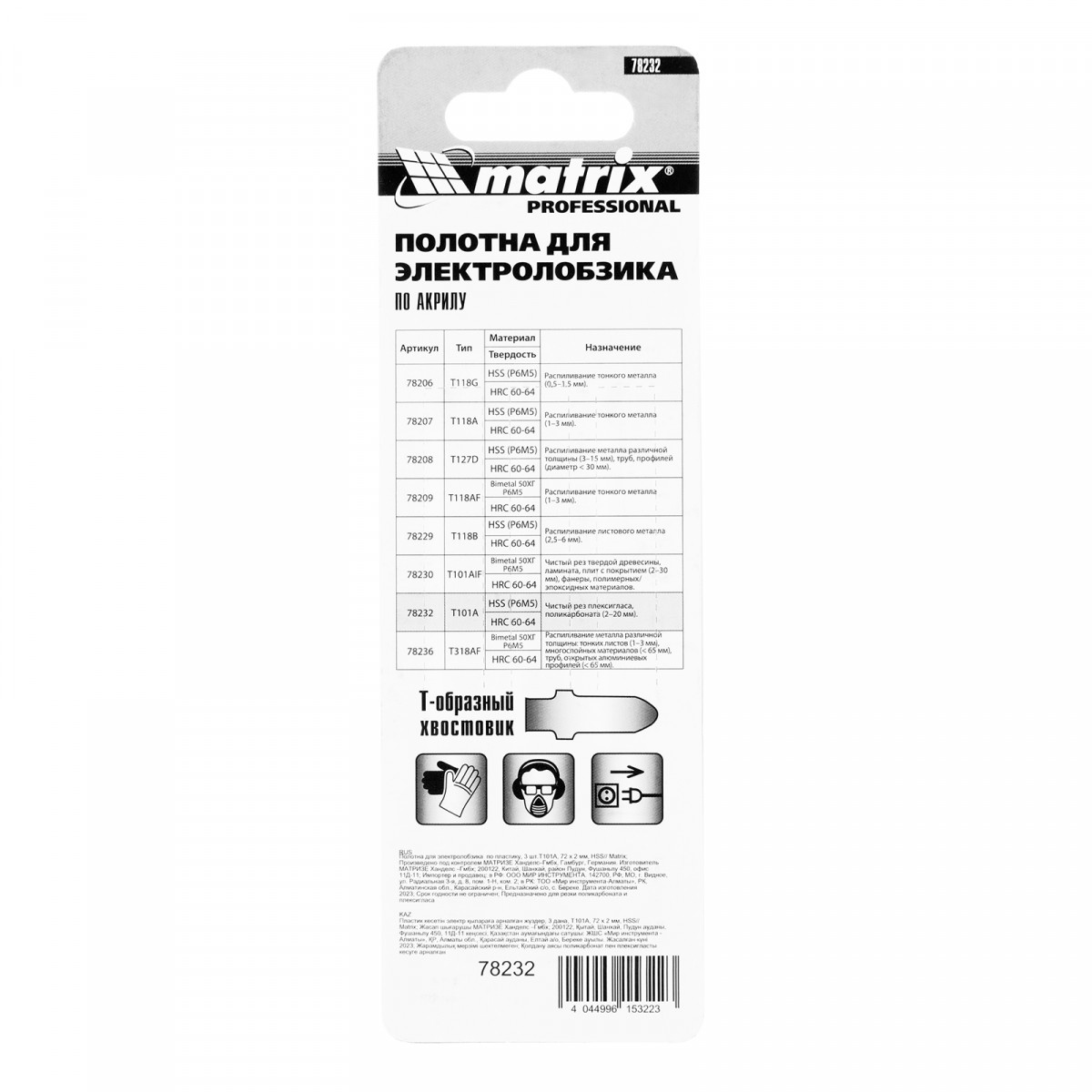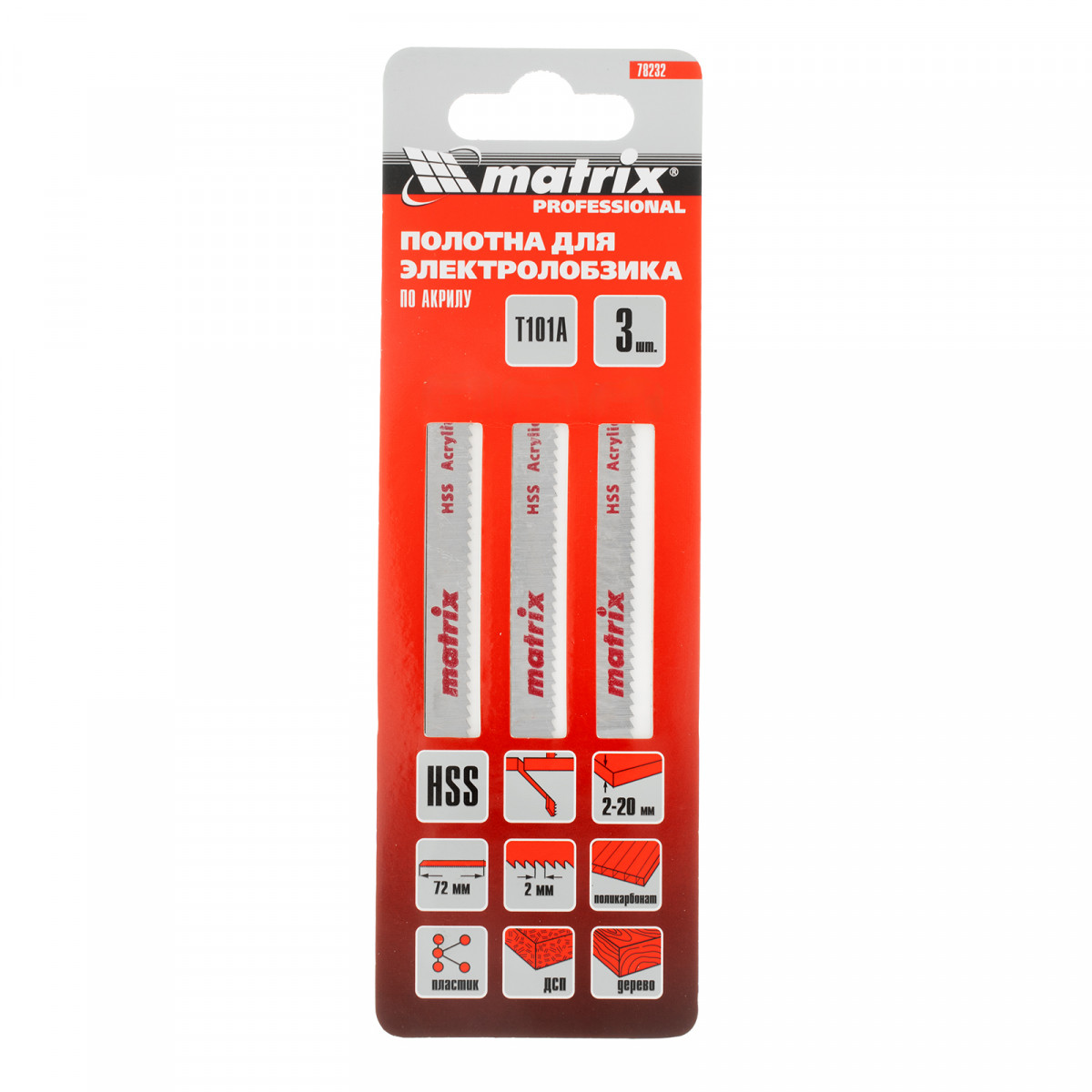 Полотна для электролобзика по пластику T101A Matrix 78232 с рабочей длиной 72 мм и шагом зубьев 2 мм, из стали HSS, 3 шт. в упаковке, предназначены для распиливания поликарбоната, плексигласа и других видов пластика толщиной от 2 до 20 мм. Могут быть установлены на любой электролобзик с зажимом под Т-образный хвостовик. Пилки пригодятся для решения профессиональных и бытовых задач.