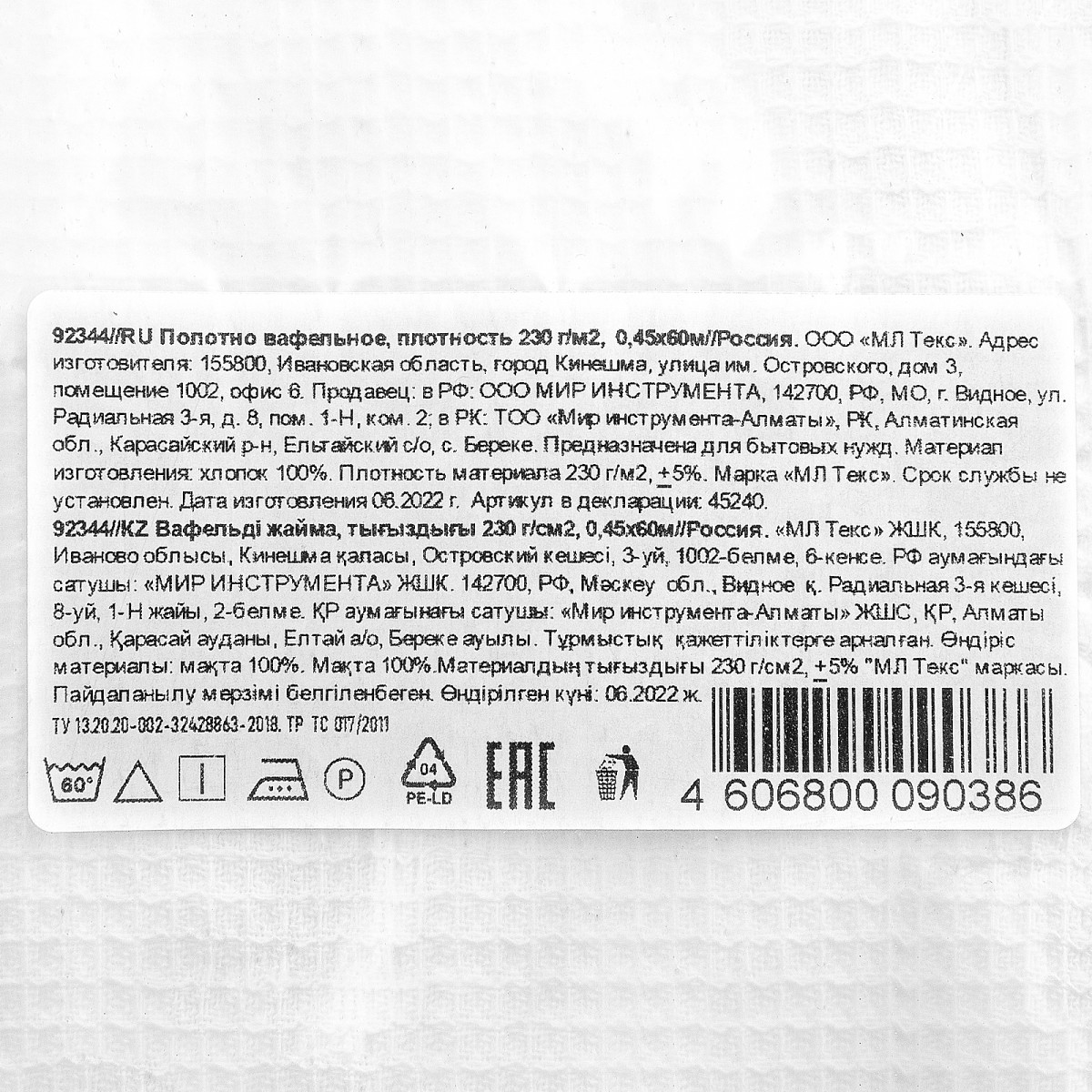 Вафельное полотно 92344 размером 0,4 х 60 м хорошо впитывает влагу и эффективно удаляет загрязнения. Может использоваться во время строительно-монтажных работ, выполнения ремонта различных механизмов, изготовления стекол и зеркал, обтирания оргтехники, автомобильных деталей и поверхностей автотранспортных средств. Пригодится в клининговых компаниях для уборки помещений, а также в медицинской индустрии, общественных учреждениях и сфере общепита.