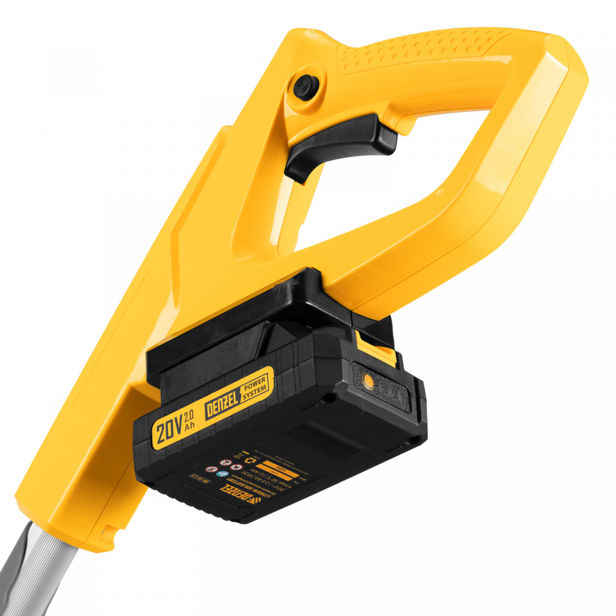 - Универсальность — газонокосилка совместима со всеми аккумуляторными батареями единой платформы Denzel Power System 20V.