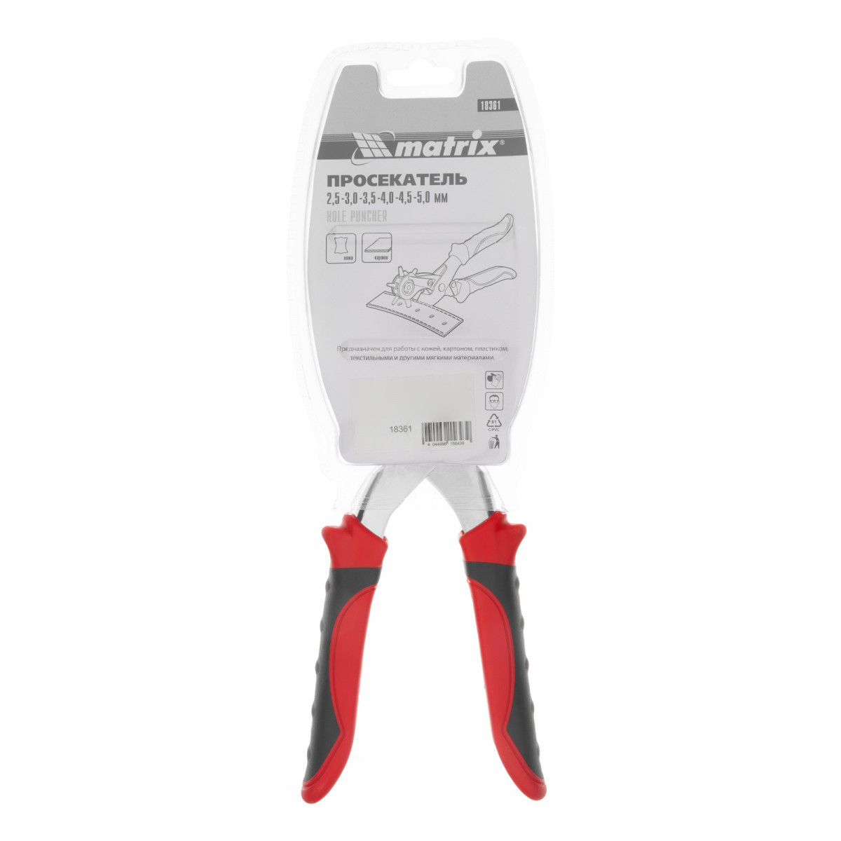 Просекатель (дырокол) Matrix 18361 позволяет проделывать в коже и картоне отверстия диаметром 2,5, 3,0, 3,5, 4,0, 4,5 и 5,0 мм. Способен прокалывать неплотные изделия толщиной до 3 мм. Идеален для работы в мастерской и дома.