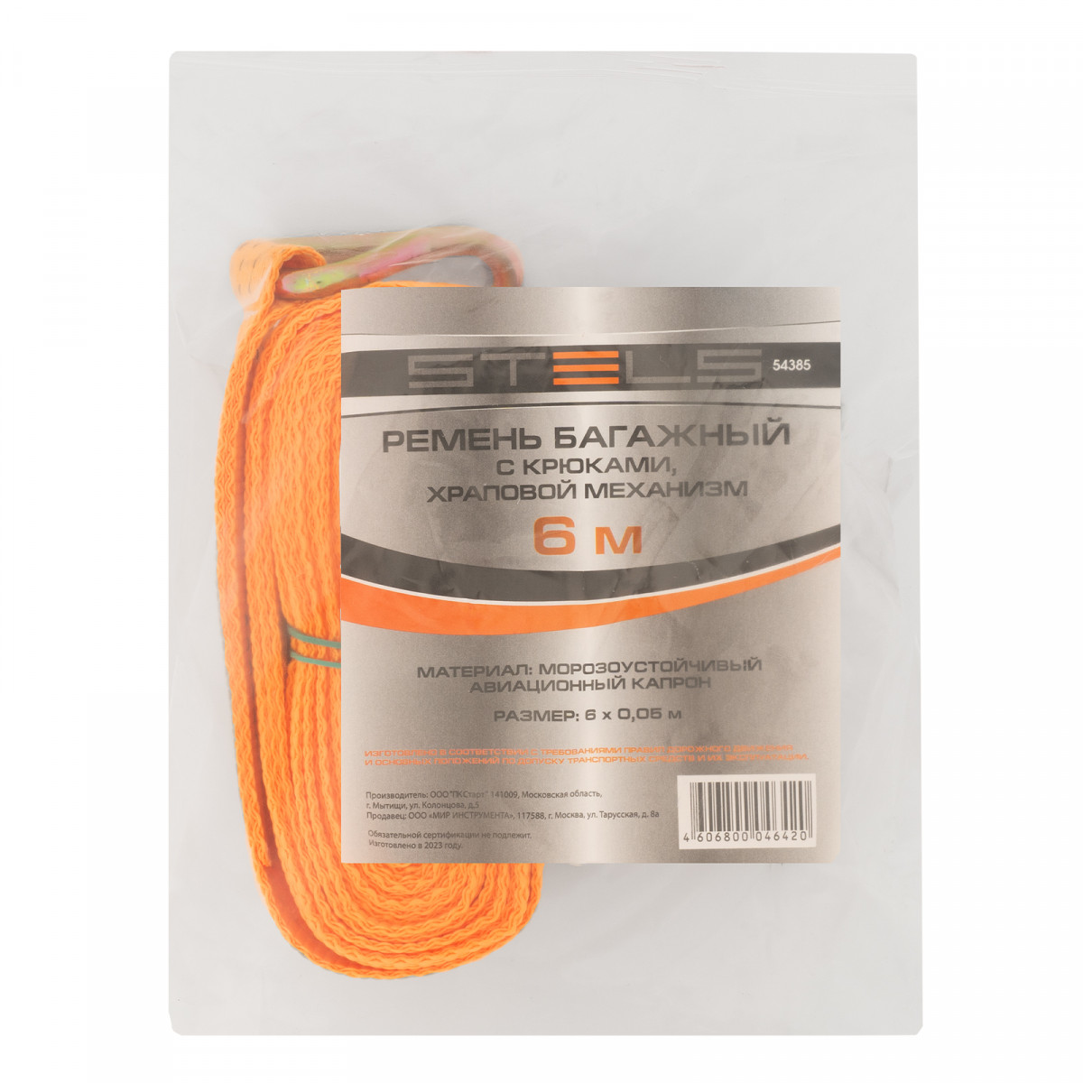 Багажный ремень с крюками Stels 54385 шириной 5 см и длиной 6 м, с храповым механизмом, предназначен для фиксации грузов на решетчатых конструкциях, например, открытых автомобильных багажниках, а также в прицепах. Пригодится для транспортировки различных предметов.