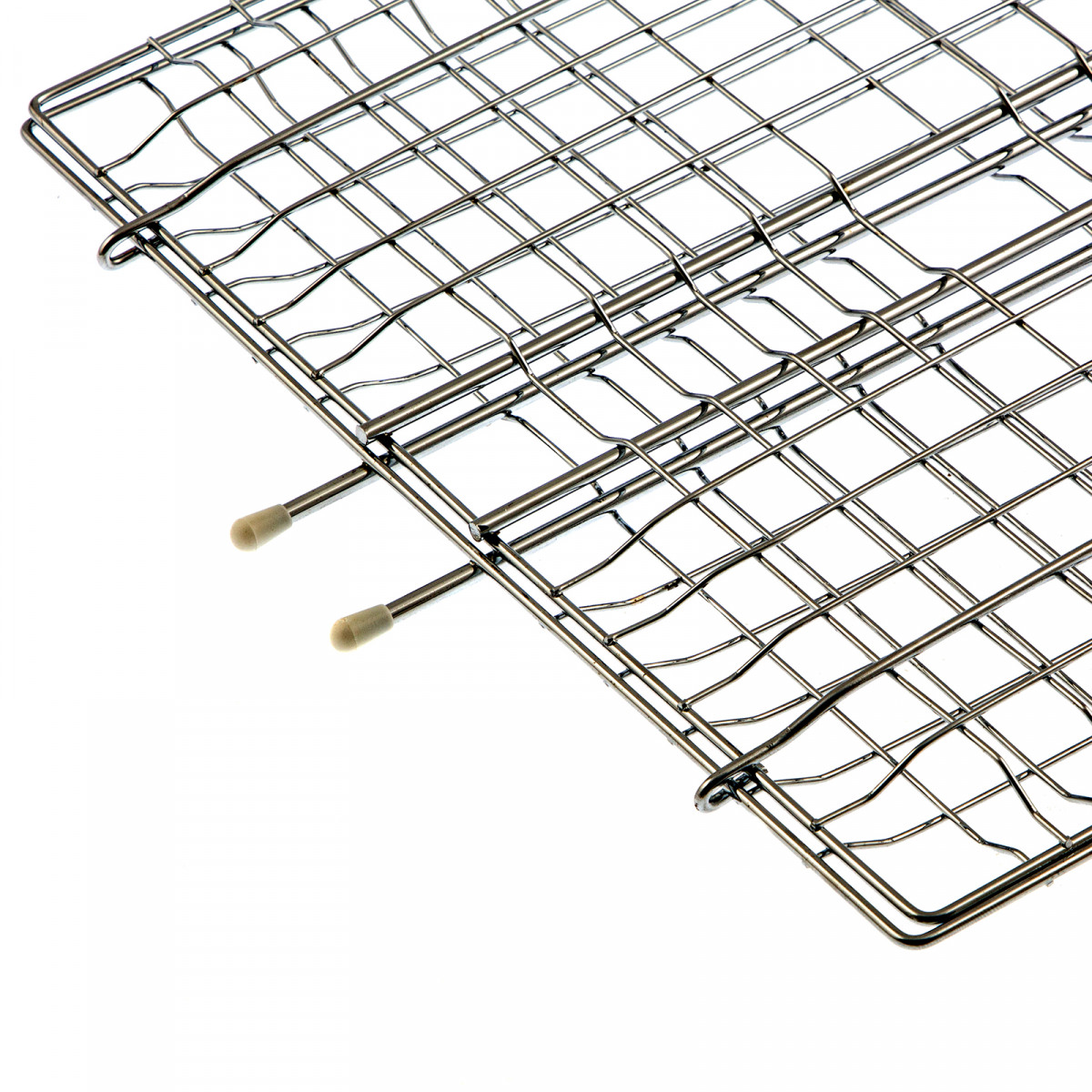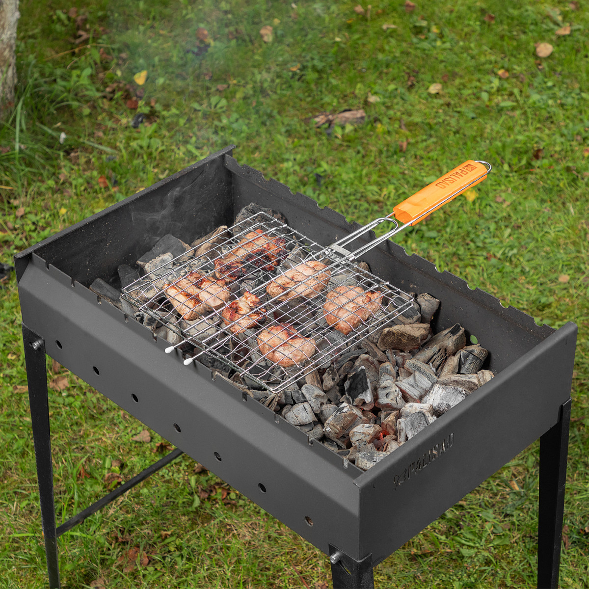 • Решетка оборудована увеличенными опорными стержнями, за счет чего прочно фиксируется на мангале, а при готовке ее площадь используется полностью.