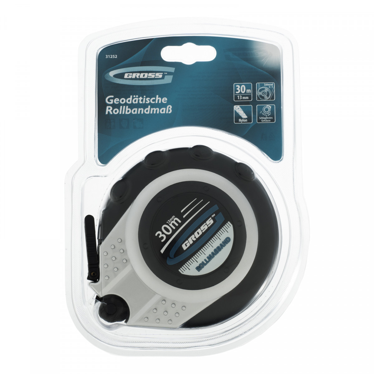 Геодезическая рулетка Gross Rollmassband 31252 в закрытом корпусе, с металлической лентой длиной 30 м и шириной 13 мм, с нейлоновым покрытием, используется для определения расстояний и размеров различных объектов. Комбинированный зацеп упрощает фиксацию измерительной ленты на измеряемой поверхности. Инструмент будет полезен на строительной площадке или земельном участке, а также при проведении обмеров внутри помещений.