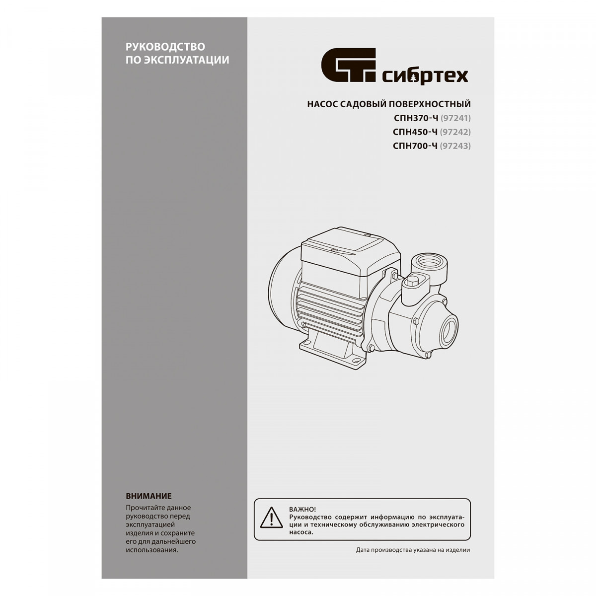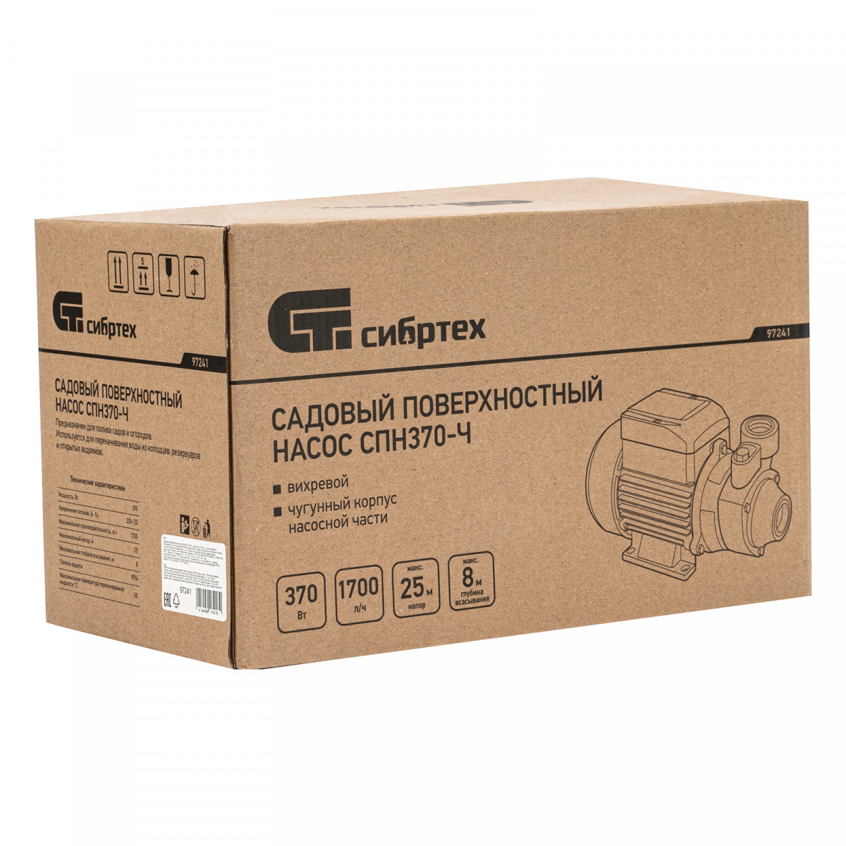Садовый поверхностный насос СПН370-Ч, 370 Вт, напор 25 м, 1700 л/ч, чугун Сибртех