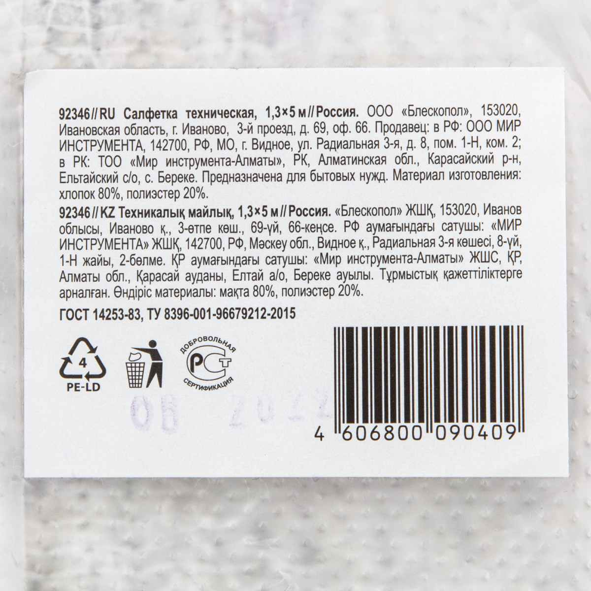 Техническая салфетка 92346 размером 1,3 х 5 м предназначена для удаления загрязнений с различных поверхностей. Может использоваться во время проведения строительно-монтажных работ, ремонта различных механизмов, автомобильных деталей. Будет полезна на строительной площадке, в мастерской, автосервисе, в офисе и на производстве.