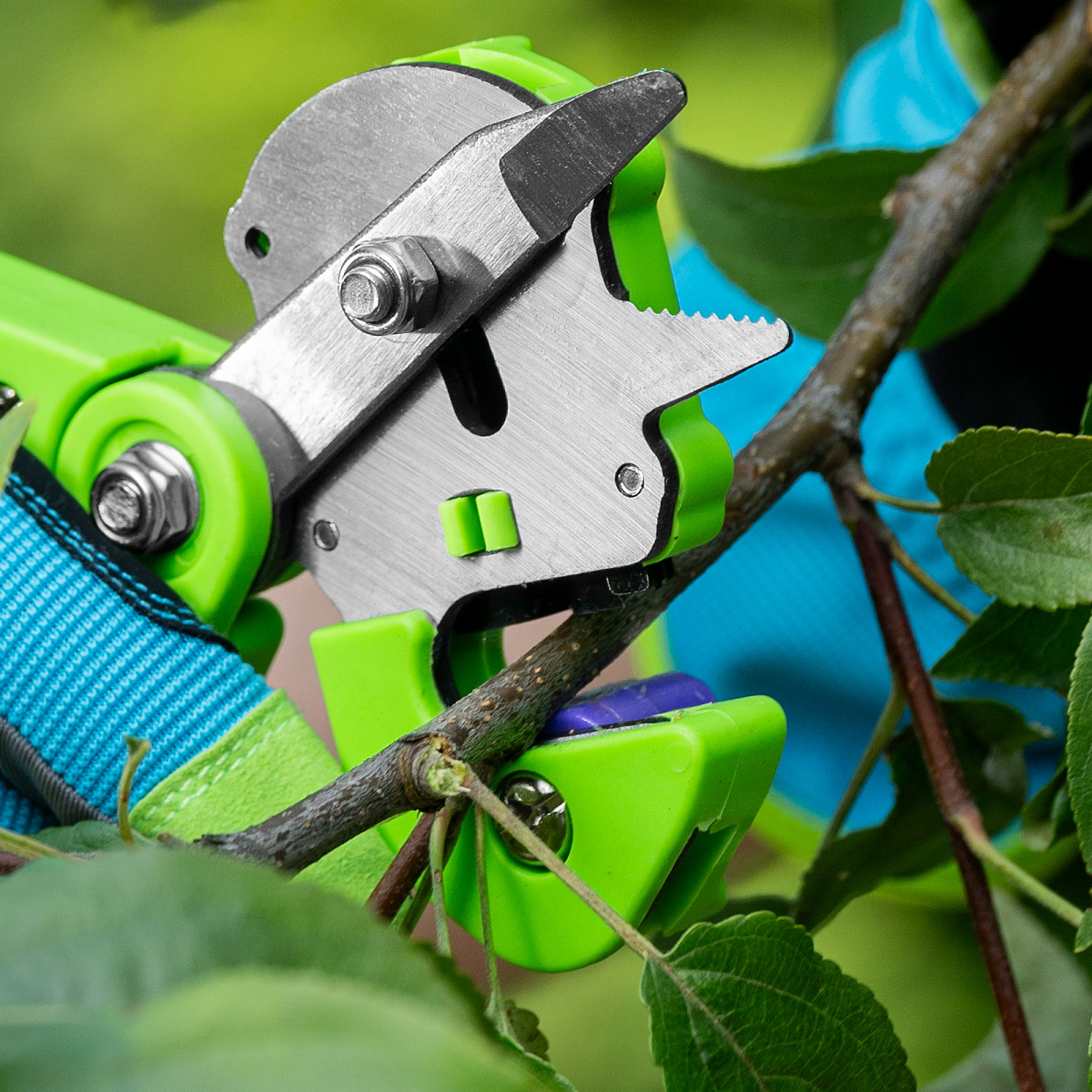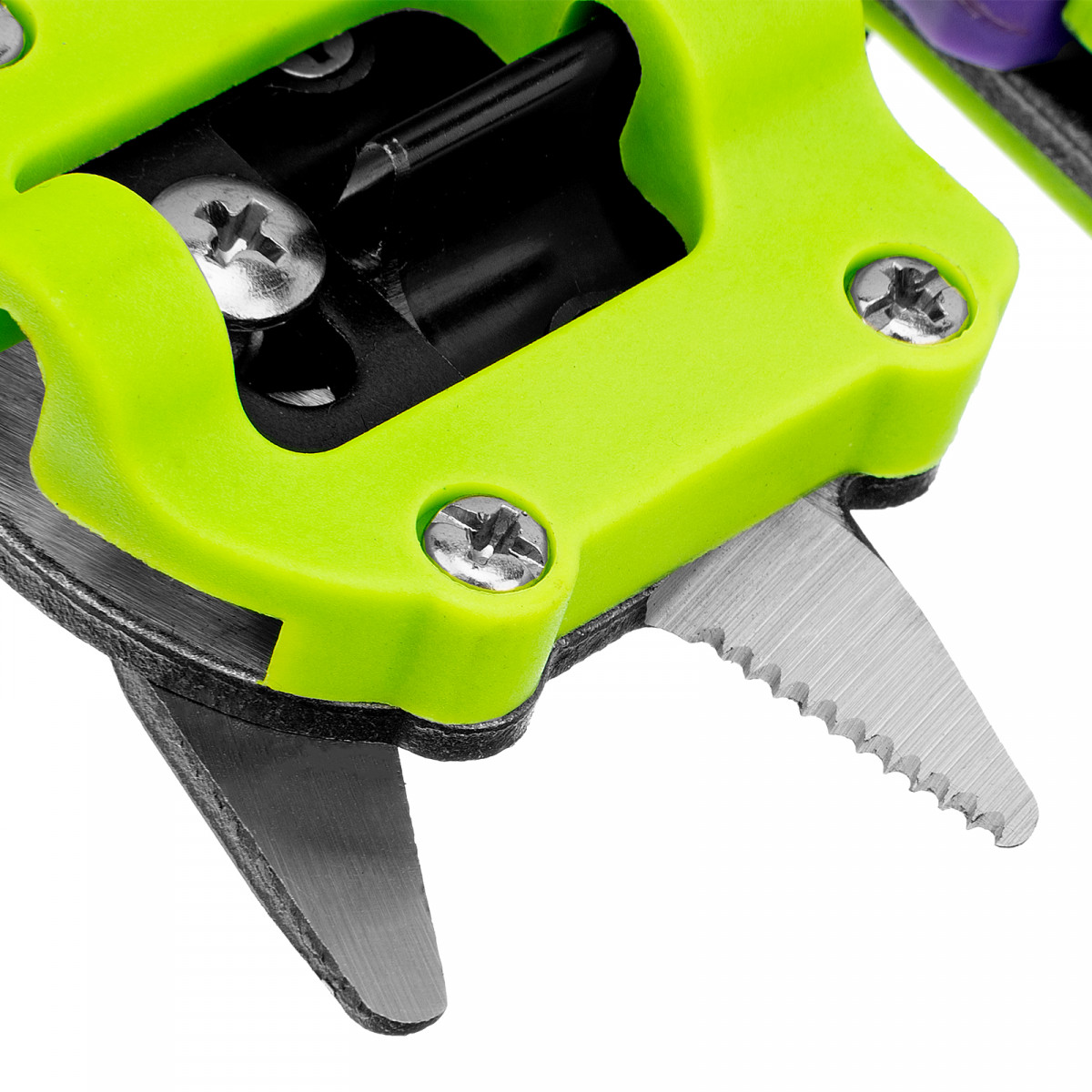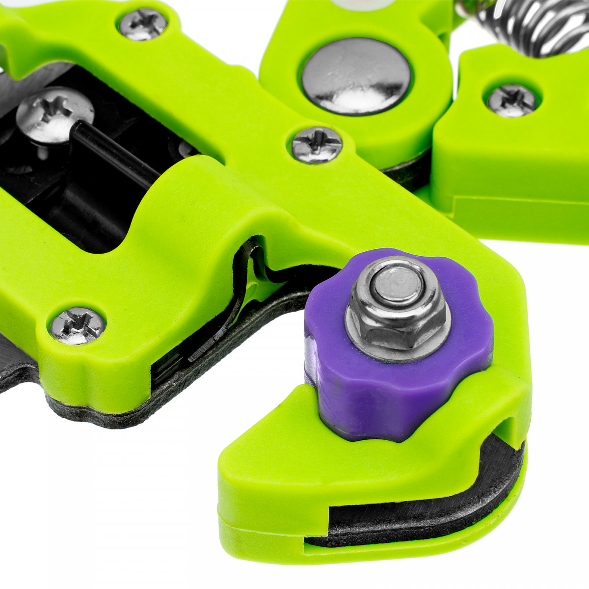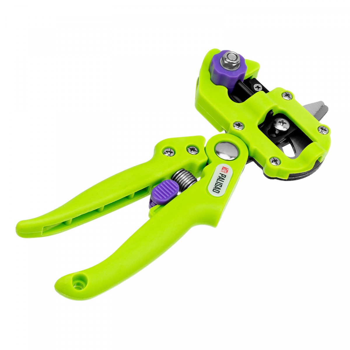Прививочный секатор Palisad 60502 длиной 215 мм, со сменными ножами, используется для прививки плодовых растений черенком. Фигурные ножи секатора изготовлены из рессорно-пружинной стали, поэтому обладают высоким ресурсом (рассчитаны на 5000 срезов без дополнительной заточки). В комплекте U-образный, V-бразный и Ω-образный ножи, что позволяет работать с черенками различной толщины и плотности. Вырезы, сделанные на подвое и привое, идеально совместимы друг с другом, дополнительная подгонка им не требуется.