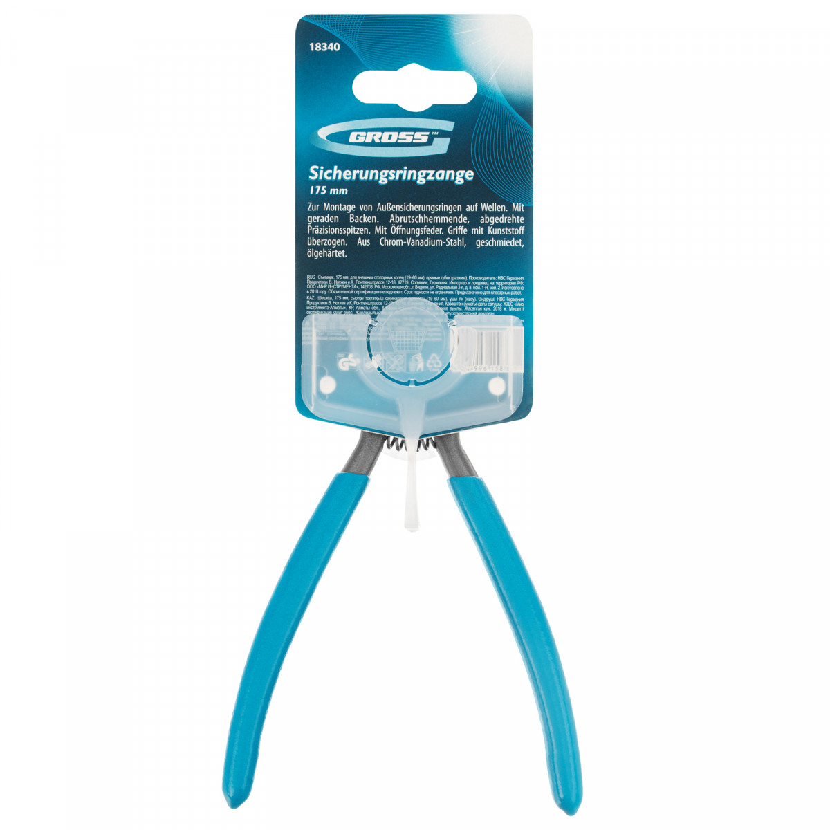 Съемник Gross 18340 длиной 175 мм, с прямыми губками, предназначен для разжима внешних стопорных колец диаметром 19-60 мм для дальнейшей установки их на вал механизма или снятия с него. Съемник применяют для колец с отверстиями — в них вставляются наконечники диаметром 1,8 мм. Инструмент будет полезен в мастерской, автосервисе, а также дома, в гараже или на даче.
