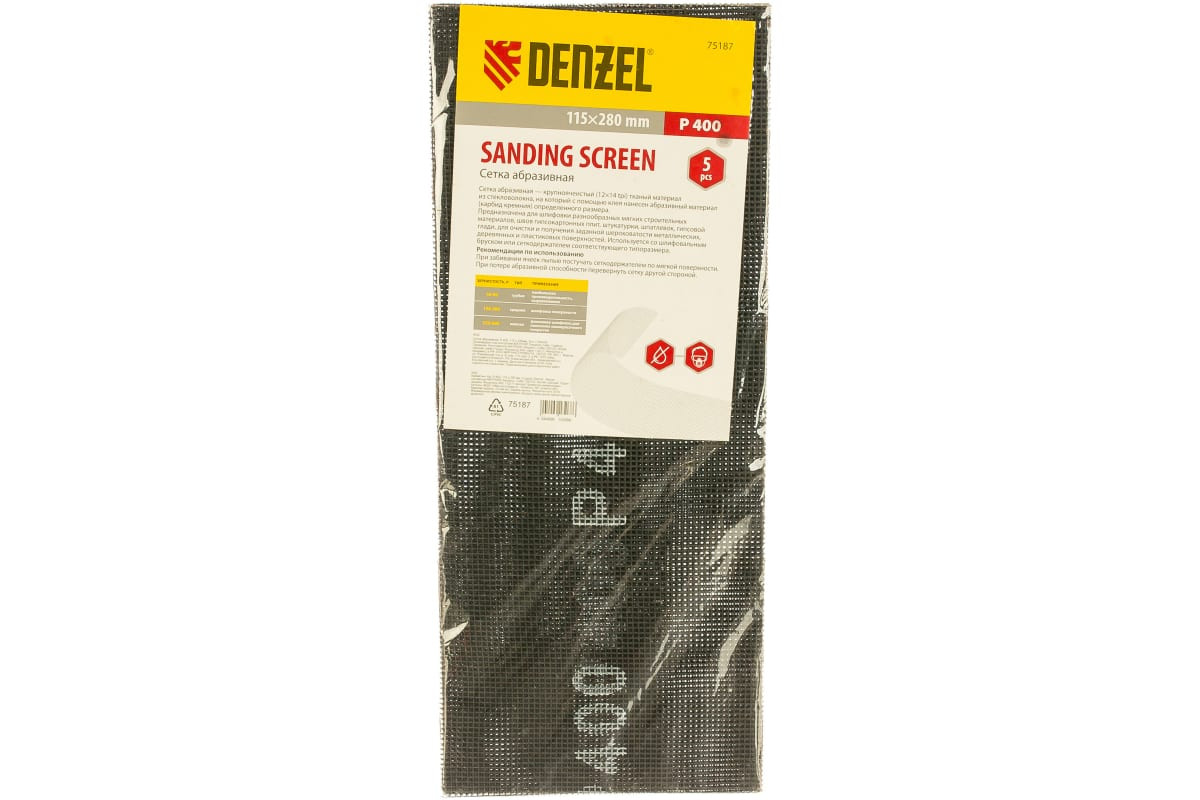 Абразивная сетка Denzel 75187, 115 х 280 мм, с зернистостью P 400, 5 шт. в упаковке, применяется для финишной обработки и придания гладкости зашпаклеванным поверхностям, а также твердой древесине и металлу. Она бережно снимает тонкий слой материала и лакокрасочного покрытия, удаляет ржавчину и заусенцы, сглаживает неровности. Абразивный слой обладает высоким ресурсом, т.к. зерна карбида кремния стачиваются медленно. Сетку устанавливают на ручные шлифовальные приспособления — бруски и сеткодержатели соответствующего типоразмера.