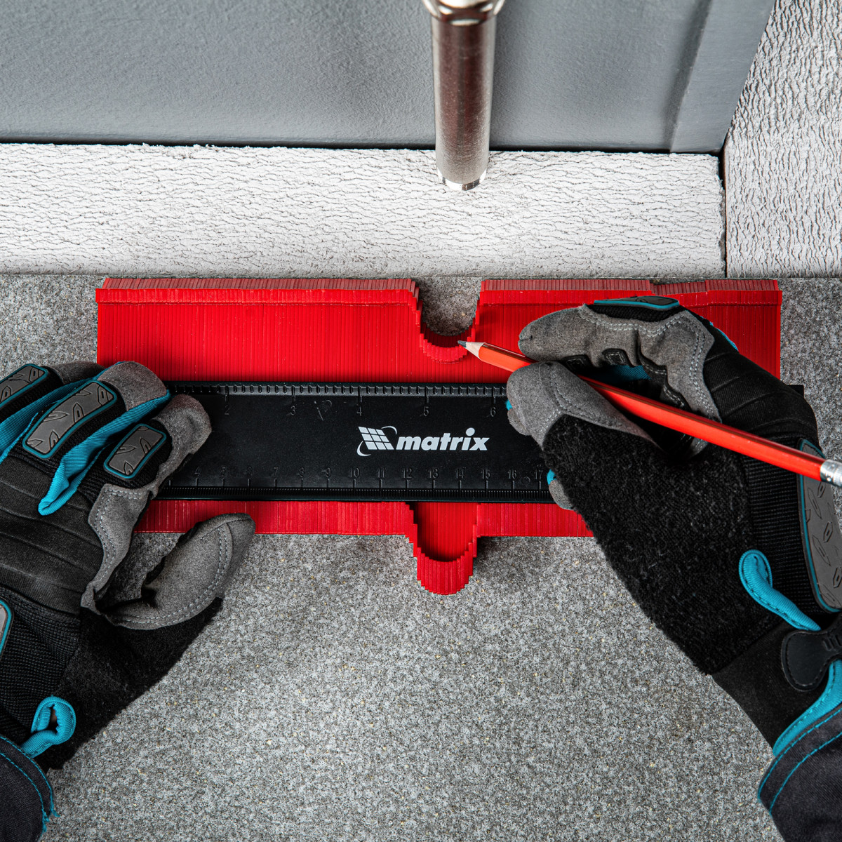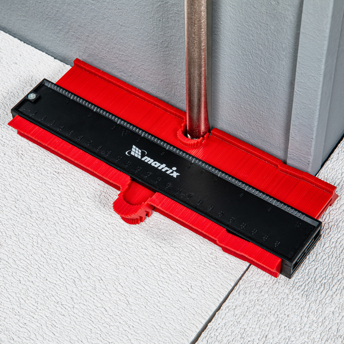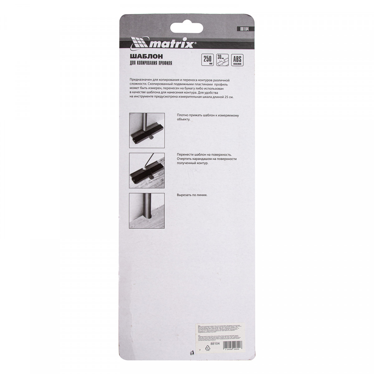 Пластиковый шаблон для копирования профиля Matrix 88104 предназначен для копирования и переноса контуров различных форм. Шаблон необходим для точной подрезки отделочных материалов (ламинат, линолеум, кафельная плитка, гипсокартон и др.) при обходе труб водоснабжения, углов и других рельефных препятствий. Перенос контуров осуществляется при помощи выдвижных пластиковых пластин. Шаблон оснащен измерительной шкалой длиной 25 см.