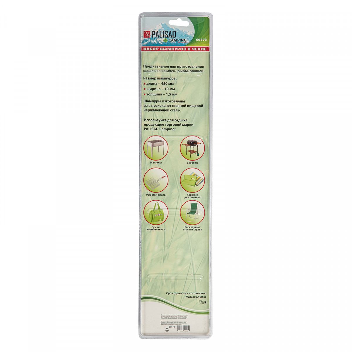 Шампуры Palisad Camping 69573 длиной 45 см, 6 штук в блистерной упаковке, позволяют легко приготовить мясо, рыбу и овощи на мангале. Пригодятся во время отдыха на даче или пикнике.