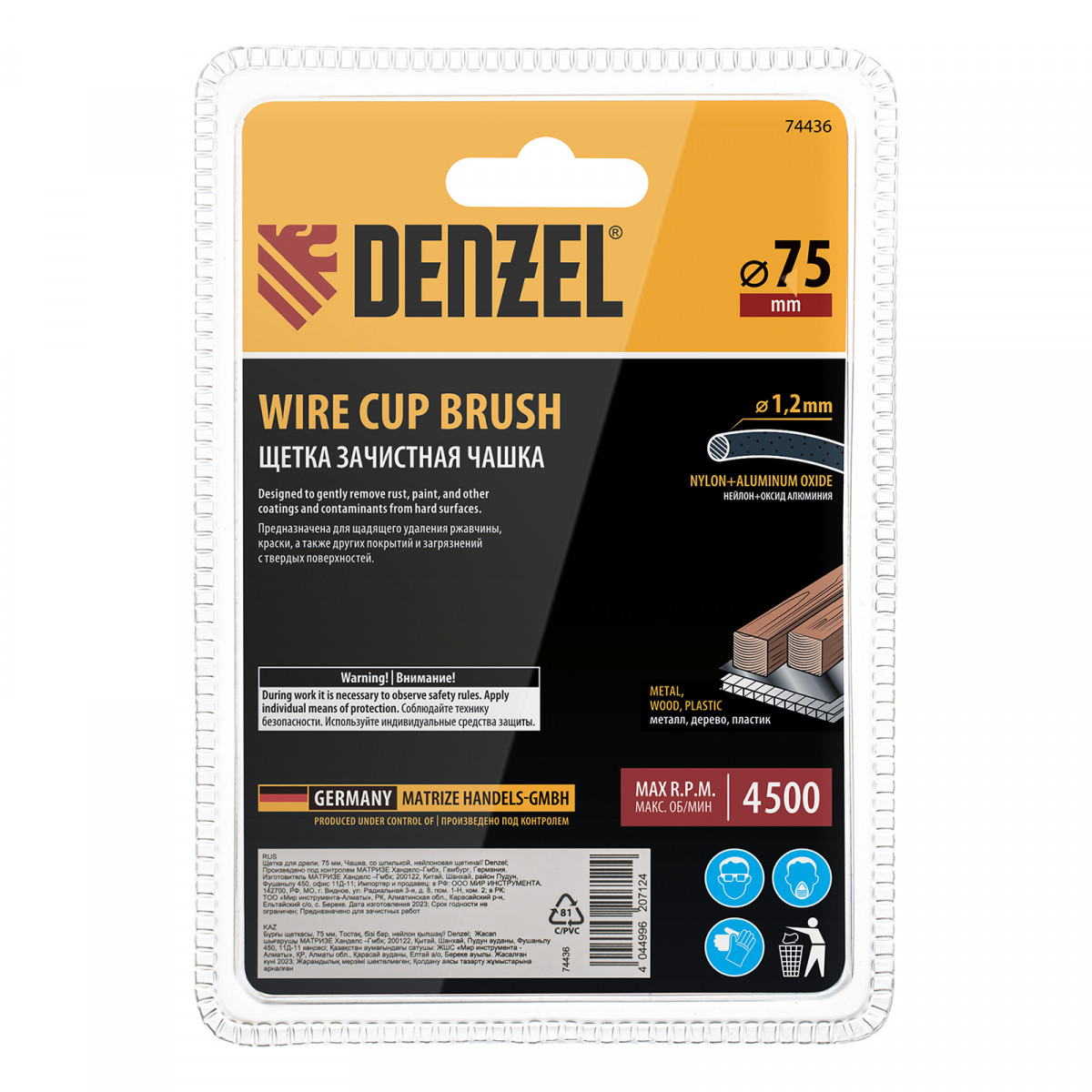 Щетка для дрели, 75 мм, Чашка, со шпилькой, нейлоновая щетина Denzel