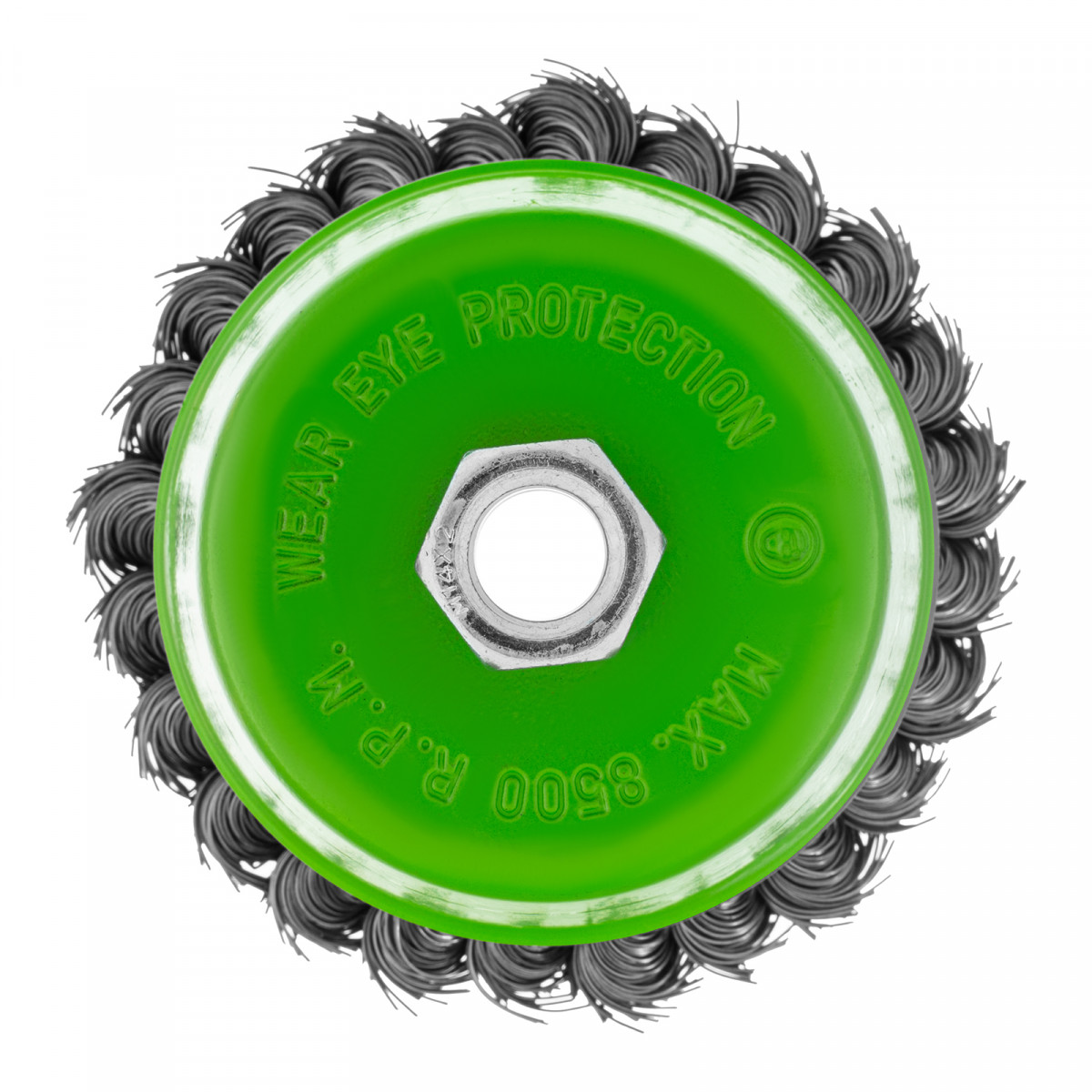Щетка Сибртех «Чашка» 746287 диаметром 100 мм, с присоединительной резьбой М14, с щетиной из крученой проволоки диаметром 0,5 мм, устанавливается на УШМ, поддерживающую работу со скоростью 8500 об/мин. Изделие предназначено для грубой (черновой) обработки поверхностей и подходит для удаления загрязнений, снятия толстого слоя ржавчины, ЛКМ, зачистки сварных швов.
