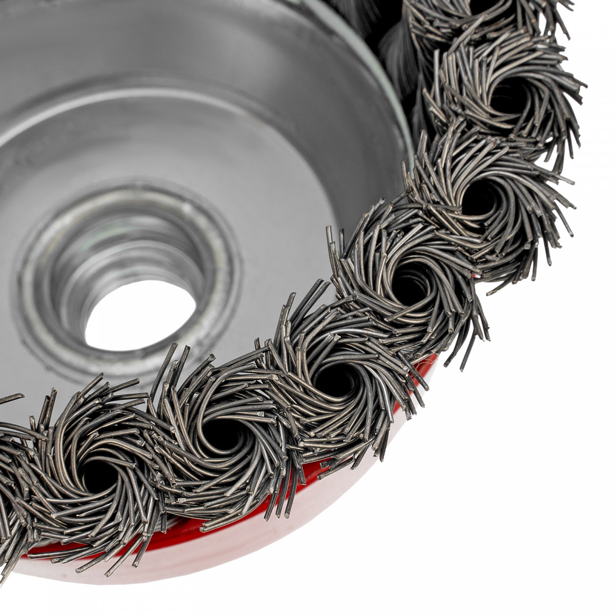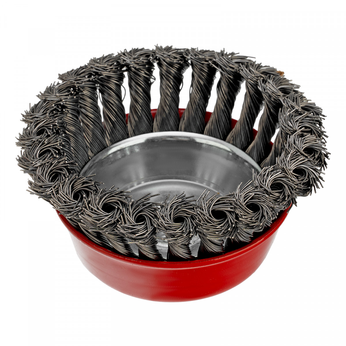 Щетка Matrix «Чашка» 74628 диаметром 100 мм, с присоединительной резьбой М14, с щетиной из крученой проволоки диаметром 0,5 мм, устанавливается на УШМ, поддерживающую работу со скоростью 8500 об/мин. Изделие предназначено для грубой (черновой) обработки поверхностей и подходит для удаления загрязнений, снятия толстого слоя ржавчины, ЛКМ, зачистки сварных швов.